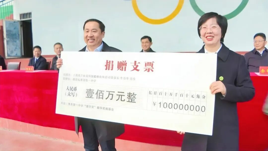1月12日上午,澧县一中1993届校友、上海真兰仪表科技股份有限公司董事长、澧县一中“澧兰奖”助学奖学基金设立者李诗华向母校首捐100万元人民币。县委书记王启武出席捐赠仪式并授牌,县领导郭劲夫、余明春、吴雅倩、杨钢及澧县一中全体师生参加。