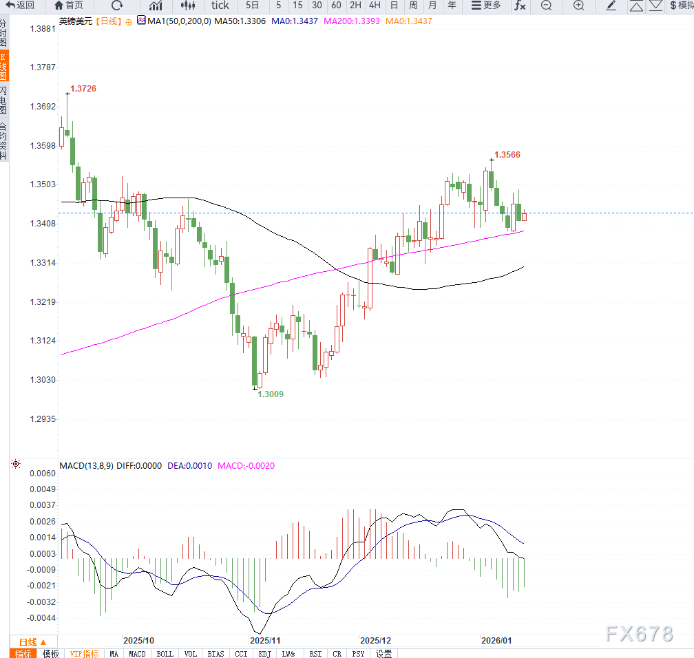 周三亚洲交易时段,英镑兑美元(GBP/USD)承压走弱,交投于1.3425附近,主要受到美元重新获得买盘支撑的影响。 ![]() Interactive Brokers分析师指出,核心CPI降温带来的乐观情绪很快消退,原因在于该报告并未促使市场将下一次降息时间从6月提前至4月。 部分固定收益投资者仍认为,美联储在去年12月的降息可能是现任主席任内的最后一次实质性宽松。 与此同时,围绕美联储独立性的讨论再度升温。美联储主席鲍威尔表示,司法部门就央行总部翻修项目相关陈述向其发出传票,并称相关举动是施压央行放松政策的“借口”。 这一事件在一定程度上增加了政策不确定性,也可能在中期影响美元表现。 从英镑自身因素来看,英国央行立场偏鸽仍是压制汇价的重要因素。 英国央行在去年12月将基准利率下调至3.75%,并暗示在通胀持续回落的背景下,2026年仍存在进一步降息空间。 尽管官员强调未来决策将更加谨慎,但市场普遍预期2月会议大概率维持利率不变,下一次25个基点的降息窗口可能出现在3月或4月。这一政策前景限制了英镑的上行空间。 从日线结构来看,英镑兑美元在此前反弹后动能有所减弱,近期价格自阶段高位回落,重新测试短期均线支撑。 5日和10日均线开始走平,显示多头力量正在降温。 技术指标方面,日线RSI已从高位回落至中性区域附近,表明市场由单边上涨转向震荡整理。若RSI继续下探,汇价短期仍存在进一步调整空间。 关键价位上,1.3400构成重要心理与技术支撑,一旦有效跌破,可能引发更深的回调,目标指向1.3320—1.3350区间。 上方阻力则关注1.3500附近,该位置同时对应前期高点区域,只有重新站稳该区间,英镑才可能重启上行趋势。 整体而言,日线形态显示GBP/USD短期偏震荡偏弱,方向选择有待新的宏观数据和政策信号指引。 ![]() : 当前英镑兑美元的回落,更像是此前上涨后的技术性修正,而非趋势性反转。美元短线受数据与避险情绪支撑,但中期仍需观察美联储政策独立性与降息节奏的变化。 相比之下,英国央行偏鸽的政策预期对英镑形成更为持续的约束。在缺乏明显利多催化的情况下,GBP/USD短期或维持区间震荡格局,需重点关注1.3400一线的得失及美英货币政策预期差的变化。