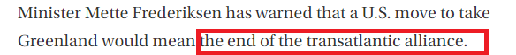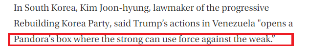 路透社报道截图 文章称,美国的欧洲盟友早已对其心有芥蒂,近期对于白宫执着于格陵兰岛一事更是公开地表达了不满。文章指出,德国总统施泰因迈尔日前就指责美国“价值观崩塌”,并敦促全世界不要让国际秩序沦为“强盗横行的丛林”,任由那些不择手段的人随心所欲地攫取利益。丹麦首相弗雷泽里克森则警告说,美国占领格陵兰岛将意味着跨大西洋联盟的终结。 此外,文章还表示,美国的做法也引起了其亚洲盟友的焦虑。韩国祖国革新党议员金俊亨日前(Kim Joon-hyung)表示,美国政府在委内瑞拉的行动“打开了一个潘多拉魔盒,即强者可以对弱者使用武力”。