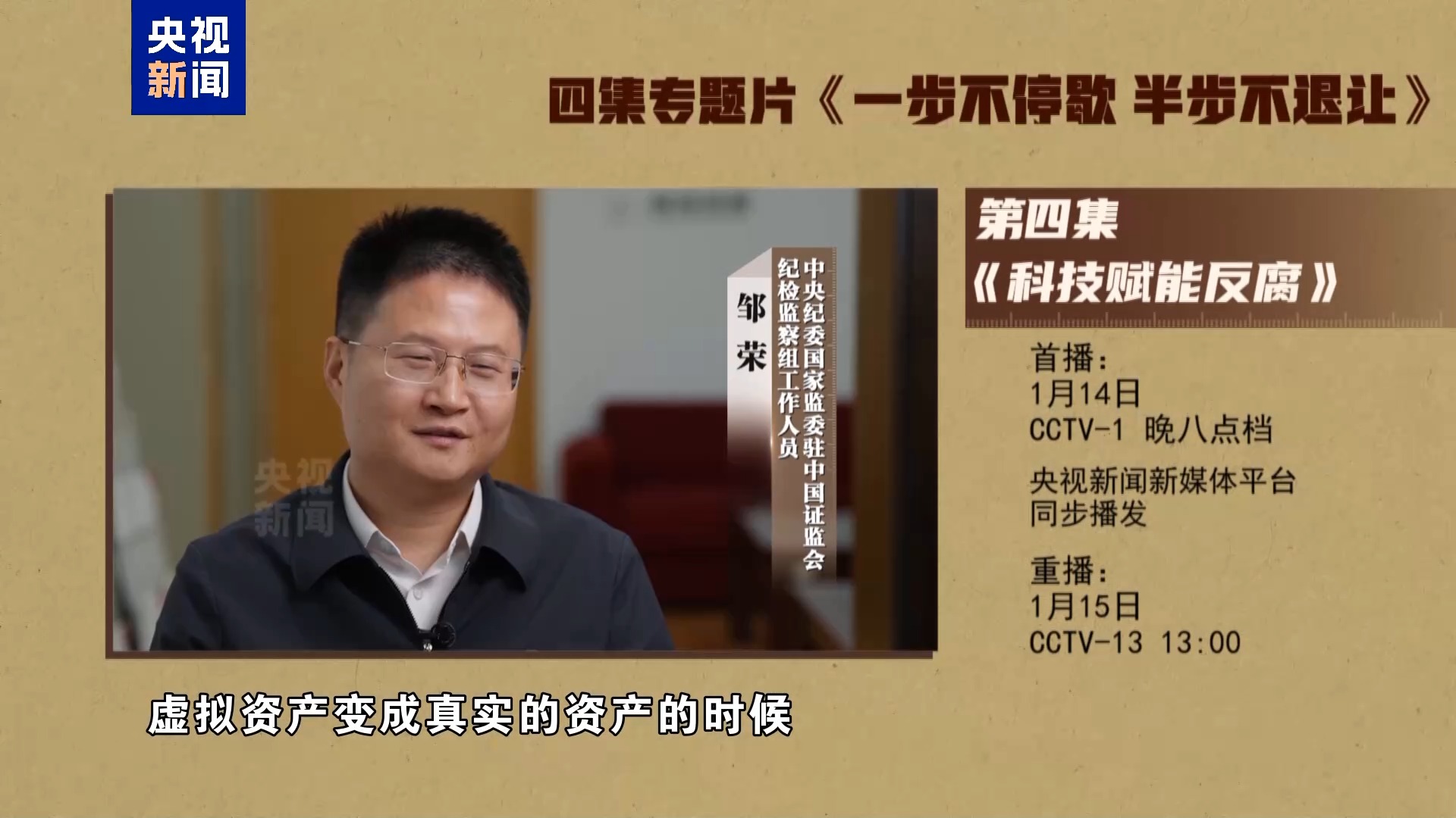 进入新时代,在以习近平同志为核心的党中央坚强领导下,我们党对反腐败斗争的规律性认识越来越深入,开展反腐败斗争的手段越来越丰富,推进反腐败斗争的方式越来越科学,反腐败战果不断扩大,成功走出一条中国特色反腐败之路。 电视专题片《一步不停歇 半步不退让》第四集《科技赋能反腐》,讲述纪检监察机关丰富防治新型腐败和隐性腐败有效办法,以信息化赋能正风反腐,充分运用科技手段精准发现不正之风和腐败问题线索、迅速有效突破案件,着力提升智慧反腐、科技反腐水平。总台央视综合频道1月14日晚8点档播出,央视新闻新媒体平台同步播发。 境外不是法外,纪检监察机关加大跨境腐败治理力度,严格依规依纪依法,运用信息技术深挖细查,让腐败行为在境外也盖不住、藏不了。