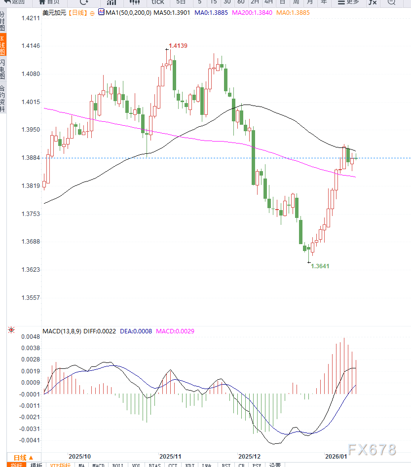 周三亚洲交易时段,美元兑加元(USD/CAD)延续涨势,交投于1.3900附近,连续第二个交易日走强。 ![]() 值得注意的是,尽管通胀有所降温,美国劳动力市场依然表现出较强韧性。 此前公布的非农就业数据超预期,失业率下降,加之ADP就业数据的四周均值保持稳健,均强化了市场对美国经济基本面相对强劲的判断,为美元提供持续支撑。 不过,USD/CAD的上行空间可能受到加元因素的制约。作为典型的商品货币,加元往往受油价波动影响显著。当前西德克萨斯中质原油(WTI)价格徘徊在每桶60.70美元附近,接近两个月高位,为加元提供一定支撑。 油价走强主要受到地缘局势推动。近期,美国暂停与伊朗方面的接触,并公开表达对当地示威者的支持,引发市场对局势升级的担忧。伊朗持续动荡叠加潜在外部介入风险,威胁其约330万桶/日的原油产量。 同时,美国方面警告称,继续与伊朗开展业务的国家可能面临新的25%关税,加剧了市场对原油供应受扰的担忧,从而推升油价。 从日线结构来看,USD/CAD整体仍运行在上升通道内,汇价维持在主要均线系统之上,显示中期趋势偏多。近期价格回升并重新逼近1.3900关口,表明多头动能尚未完全消退。 技术指标方面,日线RSI位于中性偏强区域,尚未进入明显超买状态,意味着汇价仍具备一定上行空间,但动能并不极端。 若RSI进一步走高,短线波动可能随之放大。 关键价位上,1.3920—1.3950区间构成阶段性阻力,一旦有效突破,汇价或有机会测试前期高点; 下方支撑则关注1.3820—1.3850区域,该位置同时接近短期均线密集带,若失守,汇价可能转入高位震荡甚至小幅回调。 整体来看,日线技术形态偏多,但上行节奏可能放缓,更倾向于震荡中缓慢抬升。 ![]() 当前USD/CAD的走强,核心驱动仍在于美元基本面相对稳固,美联储短期维持利率不变的预期为美元提供了清晰支撑。但与此同时,油价高企正在为加元“托底”,削弱了美元兑加元的单边上涨动能。 在美元强势与原油利多并存的环境下,USD/CAD更可能维持高位区间震荡走势,方向性突破仍需等待美国通胀和货币政策预期出现更明确变化。