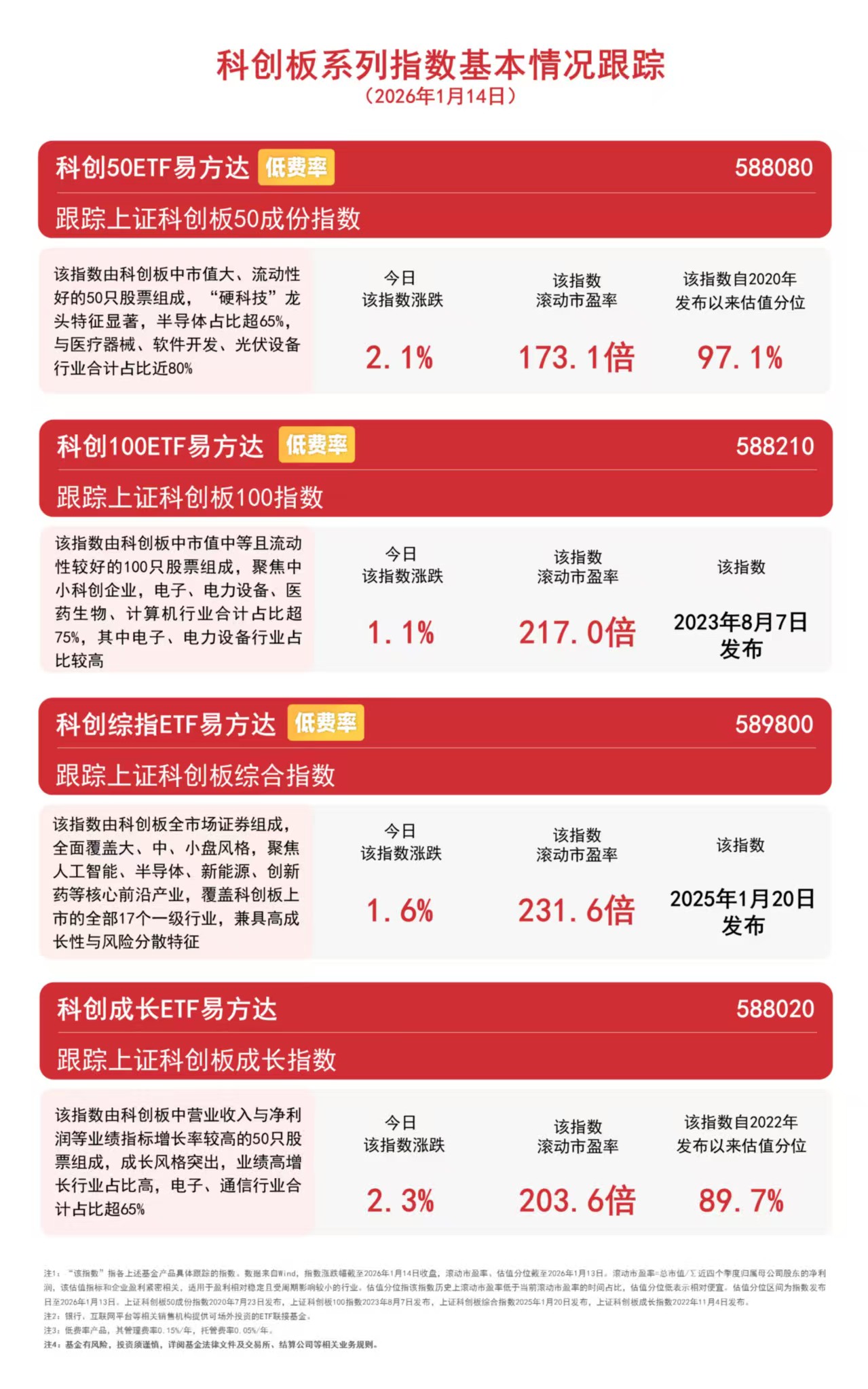 1月14日,A股市场冲高回落,AI硬件与应用概念股表现强势。截至收盘,科创成长指数上涨2.3%,科创50指数上涨2.1%,科创综指上涨1.6%,科创100指数上涨1.1%。Wind数据显示,科创50ETF易方达(588080)昨日净流入超8000万元。