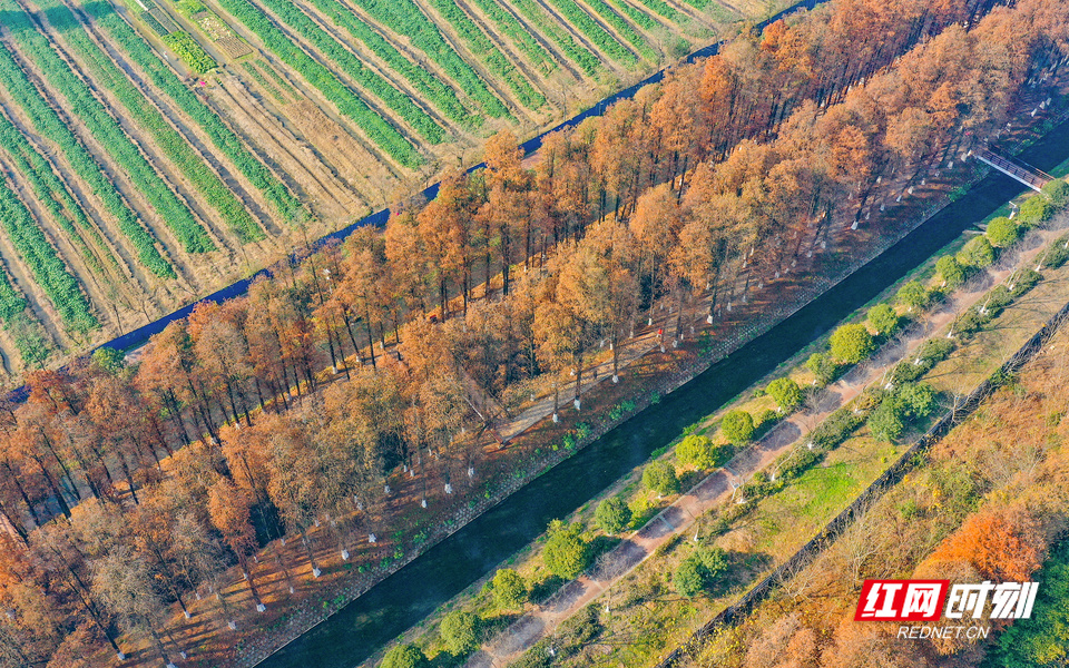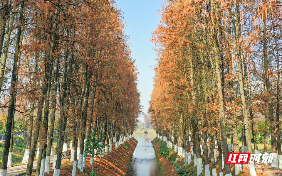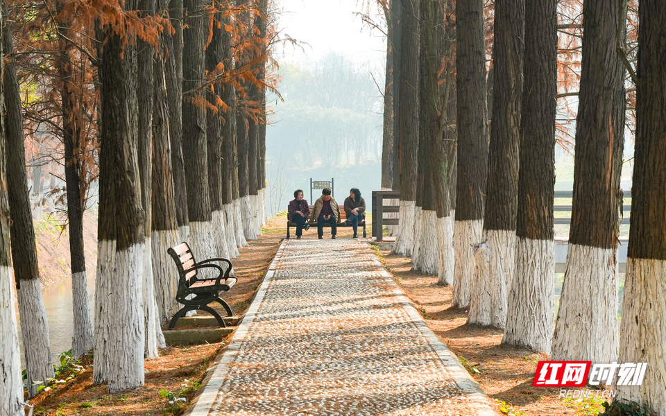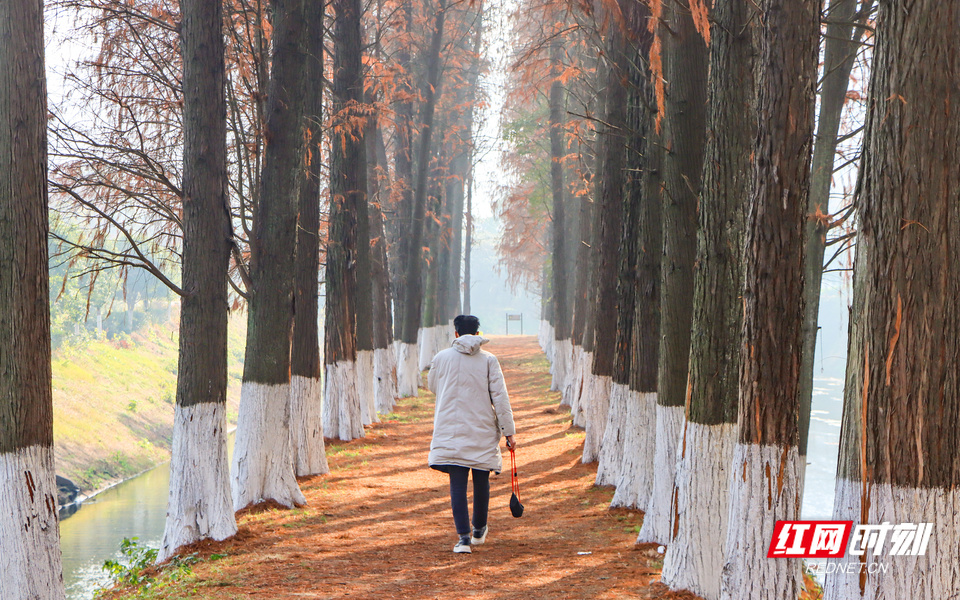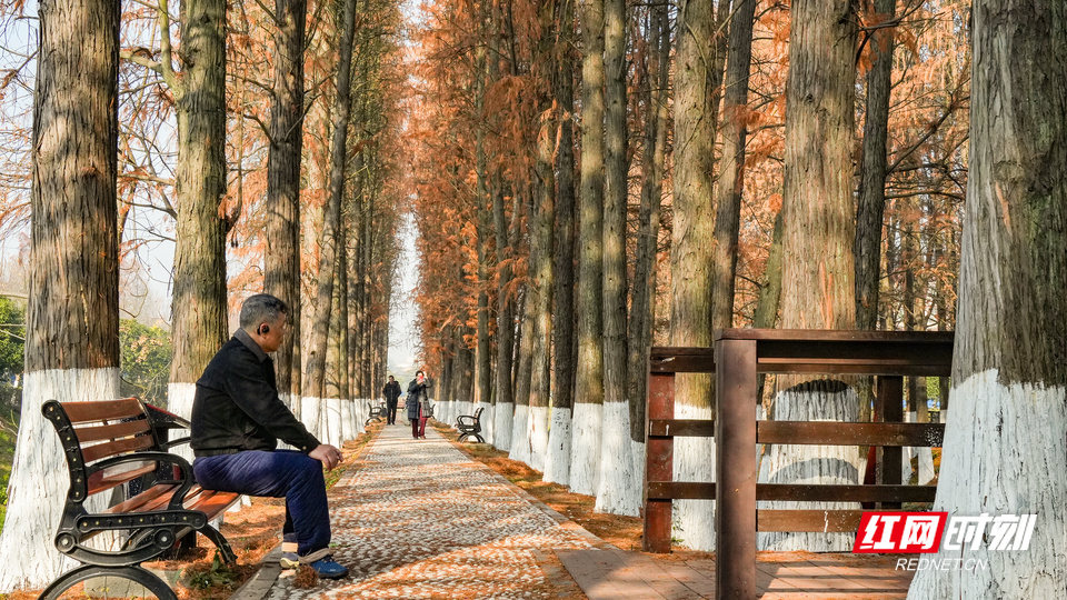 枝桠间交织着深红、赭黄与金棕的斑斓色彩。 红网时刻新闻1月13日讯(记者 宋美君 李璐 实习生 刘赢 杨安琪)冬日暖阳普照,衡阳市雁峰区岳屏镇隆桥村幸福河两岸的水杉林换上赭红与金黄交织的“盛装”,宛如一幅徐徐展开的天然油画,成为市民争相探访的冬日秘境。 1月13日上午,记者在现场看到,两排高耸挺拔的水杉整齐列队,枝桠间交织着深红、赭黄与金棕的斑斓色彩,宛如披上了“黄金甲”。阳光穿过层层叠叠的枝梢,在铺满金色“地毯”的林间小道上投下细碎跃动的光斑。 林间光影斑驳,游客络绎不绝。年轻人举着手机用人像模式定格美景,阿姨们结伴学习拍照姿势,老人们则坐在长椅上闲话家常,享受惬意时光。 “连续晴好天气,特意来这里打卡,红杉配碧水的景色太治愈了,比待在家里舒服多了。”市民周女士享受着水杉林带来的冬日柔美,坦言道:“旅游不用去远方,好景就在身旁。” |
