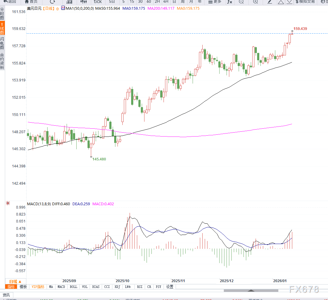 周三欧洲早盘,美元兑日元(USD/JPY)升至159.45附近,创下一年半以来的新高,随后回落。日元在主要货币中整体表现最弱,反映出市场对日本政治和政策前景的担忧持续升温。 ![]() 与此同时,市场对日本今年可能采取更为宽松的货币与财政政策仍抱有较高预期,这也进一步限制了日元的反弹空间。 在避险属性削弱与政策预期偏鸽的双重影响下,日元持续跑输主要货币。 美元方面,美国通胀数据整体符合预期,支撑美元维持强势。 最新数据显示,美国12月CPI同比增长2.7%,核心CPI同比增长2.6%,均与市场预测一致。这强化了市场对美联储在短期内维持利率不变的判断。 从技术面来看,USD/JPY整体维持明显的多头结构,汇价持续运行在上升趋势通道内,且均线维持多头排列,显示中期上行趋势依然完好。 近期K线连续收于前高附近,表明多头情绪占据主导,但高位实体有所收敛,暗示追涨动能开始放缓。动能指标方面,14周RSI升至70.85并进入超买区域,显示短线涨势偏热,存在阶段性整理或高位震荡的可能,但尚未出现明确的反转信号。 在趋势未被破坏的前提下,回调更可能被视为多头修正而非趋势反转,下方重要支撑158.00整数关作为关键支撑,只要该区域不被有效跌破,USD/JPY整体仍维持偏多运行,160整数关口仍是上方的重要心理阻力位。 ![]() 综合来看,美元兑日元的上涨更多由基本面和政策预期共同驱动。日本政局不确定性与宽松政策预期持续压制日元,而美国通胀保持韧性则为美元提供支撑。 不过,从技术角度看,USD/JPY已处于高位且动能指标超买,短期追高风险正在上升。后续走势仍需重点关注日本政局进展及美联储政策信号,若缺乏新的催化因素,汇价更可能进入高位震荡而非快速单边上行。