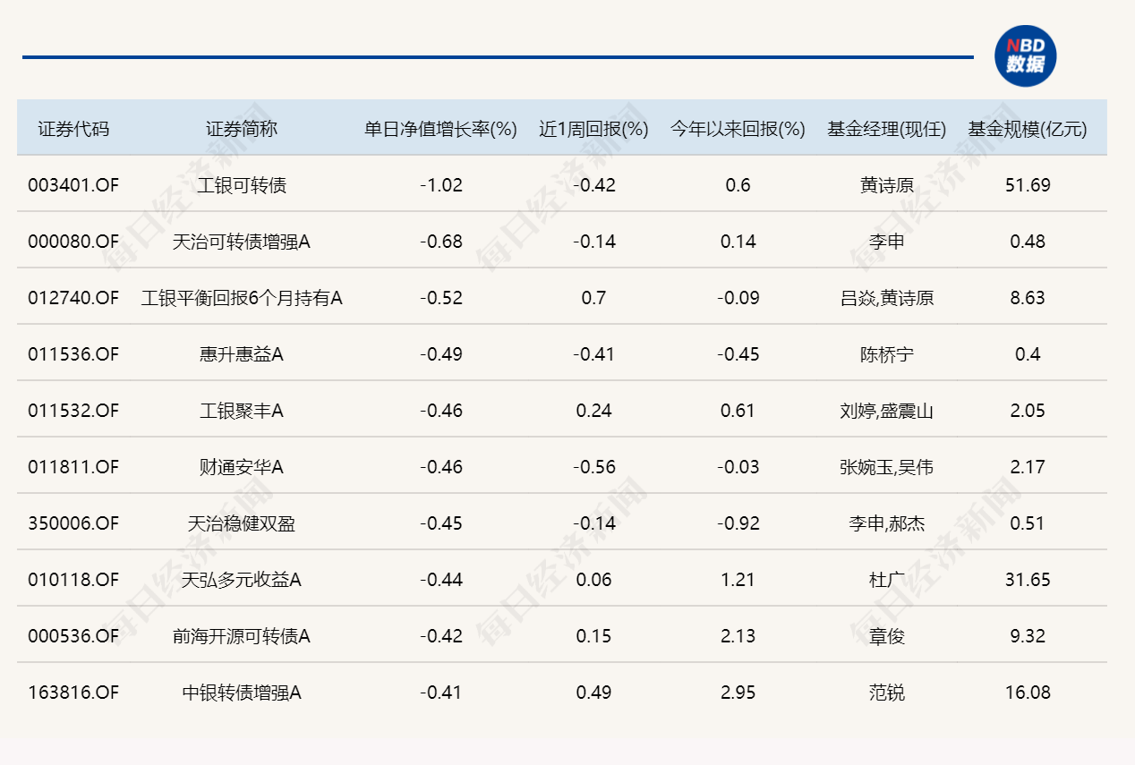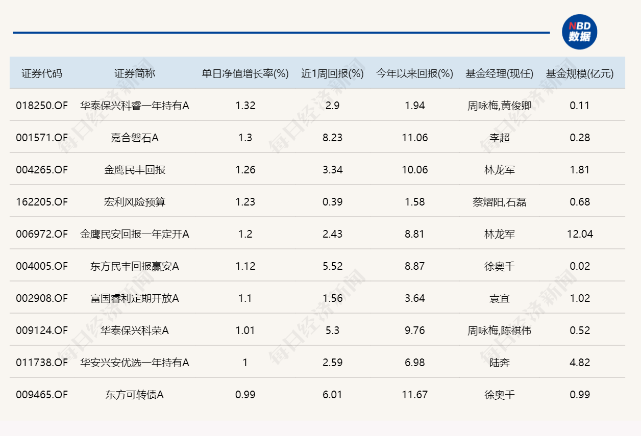 每经记者|肖芮冬 每经编辑|赵云 1月14日,市场冲高回落,沪指午后快速翻绿。板块来看,AI应用概念爆发,算力硬件概念午后拉升,半导体板块走高。下跌方面,能源金属、保险、银行等板块跌幅居前。全市场超2700只个股上涨。沪深两市成交额3.94万亿元,较上一个交易日放量2904亿。 下面一起来看今天公募基金的表现。 (注:榜单1、榜单2仅选取灵活配置型、偏股混合型和普通股票型三类产品作为主动基金的代表,纳入统计;债基相关榜单包括各类主、被动债券型基金) 1.单日涨幅榜