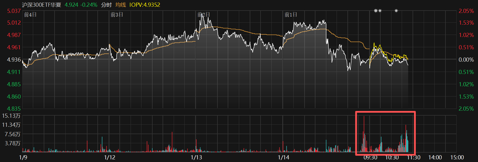 1月15日早盘,前期强势的AI应用、商业航天退潮,沪深300ETF持仓股中国卫通、润泽股份、用友网络等板块权重股跌超8%;与此同时,此前处于震荡的半导体设备、新能源及周期(锂电、化工)方向回暖,沪深300ETF持仓股紫光国微涨停,其余持仓股华友钴业、江西铜业、赣锋锂业、中国巨石、洛阳钼业均上涨超4%。 另外,值得注意的是,沪深300ETF华夏(510330.SH)盘中下探时,成交显著放量,或有资金逢低入场。据悉,沪深300指数汇集了沪深两市大盘蓝筹股,传统蓝筹+新质生产力均衡分布,是A股标杆性指数,也是类平准资金的“压舱”资产。沪深300ETF华夏(510330.SH)为全市场同类标的费率最低,充分让利投资者。