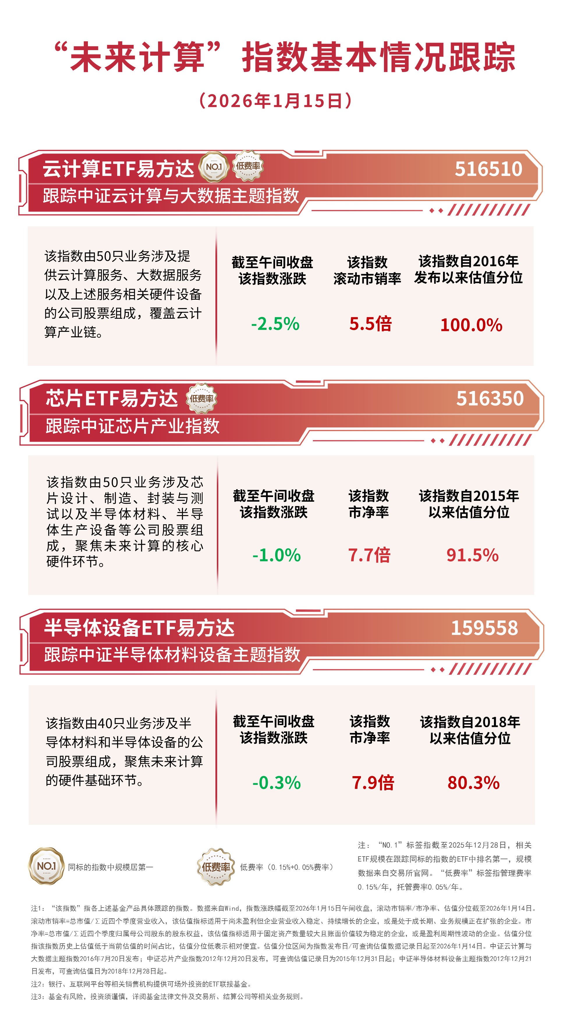 01月15日早盘,科技方向集体降温,半导体设备板块跌幅相对较窄,指数层面,中证云计算与大数据主题指数下跌2.5%,中证芯片产业指数下跌1.0%,中证半导体材料设备主题指数下跌0.3%,资金逆势布局,半导体设备ETF易方达 ...