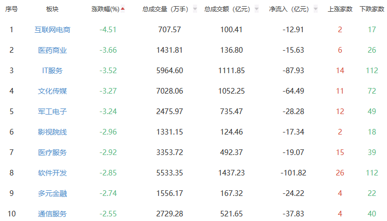 A股三大指数今日涨跌不一,截至收盘,上证指数报4112.60点,跌幅0.33%,成交额11759.15亿元;深证成指报14306.73点,涨幅0.41%,成交额17295.81亿元;创业板指报3367.92点,涨幅0.56%,成交额8412.62亿元。 行业板块方面,贵金属、电子化学品、农化制品等板块涨幅居前,互联网电商、医药商业、IT服务等板块跌幅居前。 A股市场板块涨跌幅排行