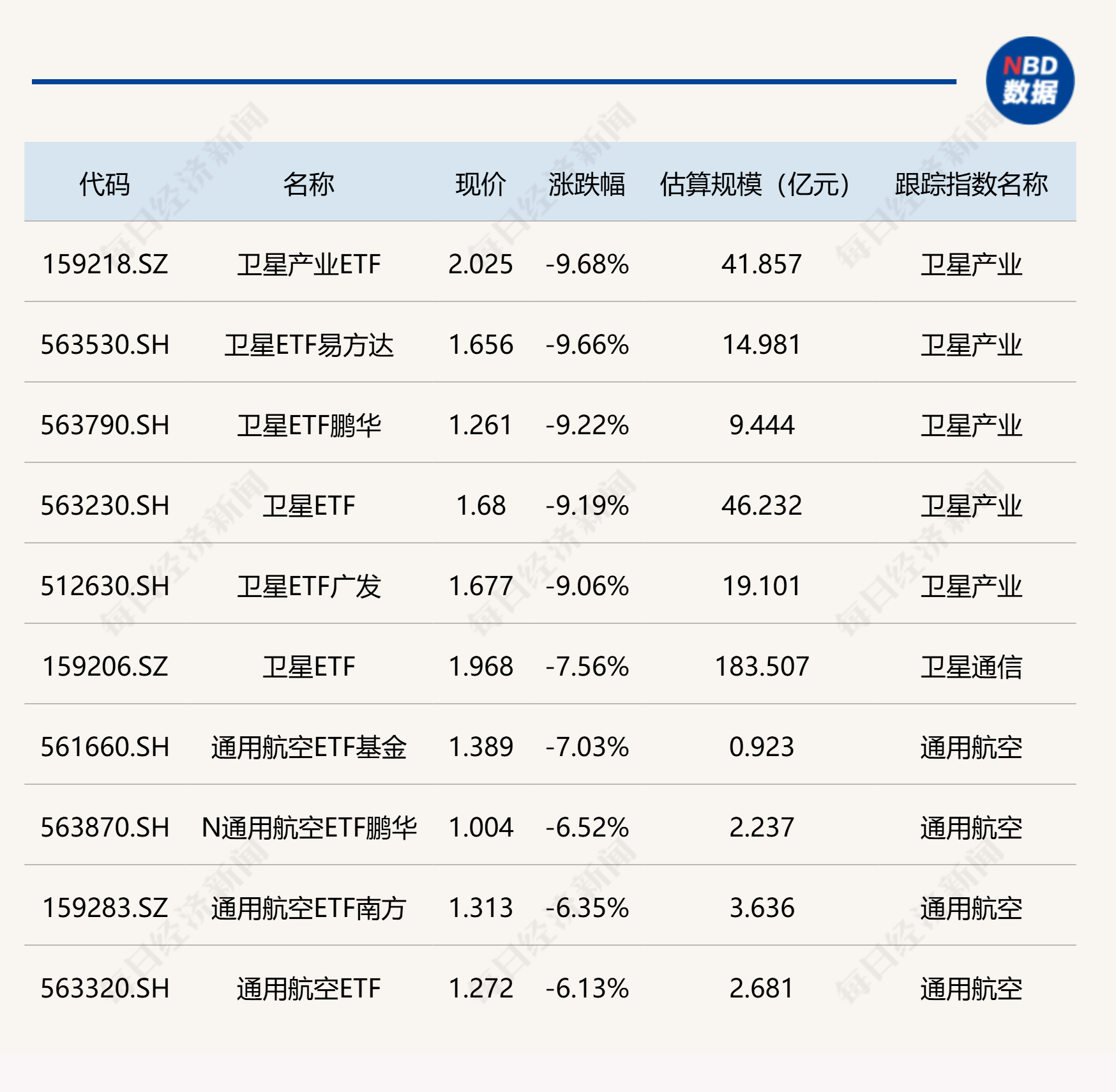 有分析表示,在AI浪潮和国产化大背景下,国内先进产线未来扩产需求持续存在,半导体设备作为晶圆代工扩张的基石,同时是实现产业链自主可控的重要环节,国产半导体设备企业有望迎来发展机遇。 下跌方面,卫星相关ETF跌超9%。
