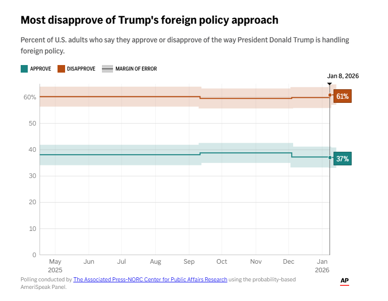 美联社报道截图 文章还关注到,约57%的美国民众不认可美国政府处理委内瑞拉问题的方式,61%的美国民众对其整体外交政策持否定态度。只有少数人认为美国政府对委内瑞拉的干预对美国国家安全或经济具有积极影响。 文章说,民意调查显示,多数美国人不希望本国更多介入国际事务。近半数美国人希望美国在国际事务中扮演“更不活跃”的角色,仅约两成美国成年人希望国家更积极参与全球事务。 |