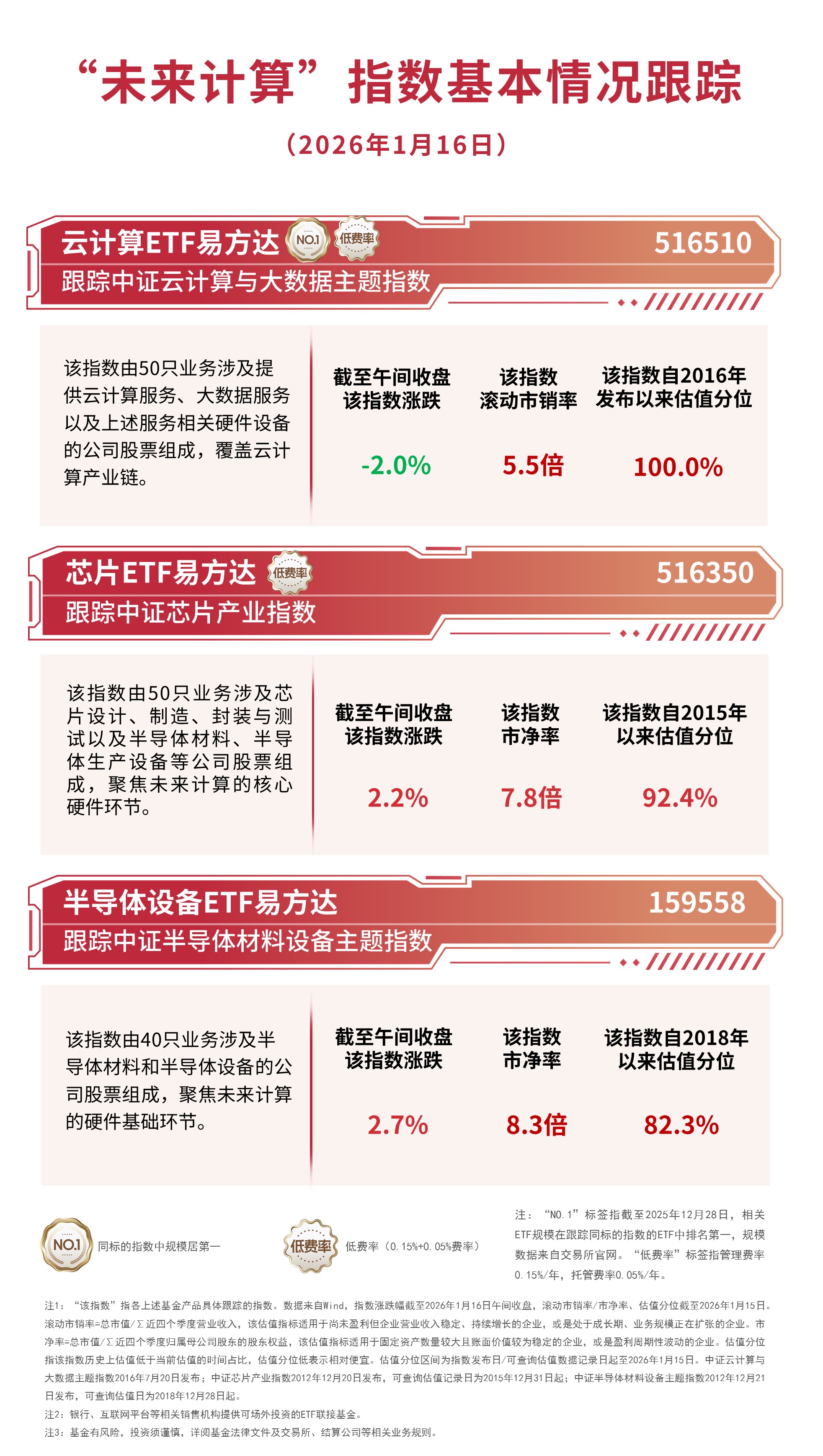 截至午间收盘,中证半导体材料设备主题指数上涨2.7%,中证芯片产业指数上涨2.2%,中证云计算与大数据主题指数下跌2.0%,半导体设备ETF易方达(159558)半日净申购约1.8亿份。