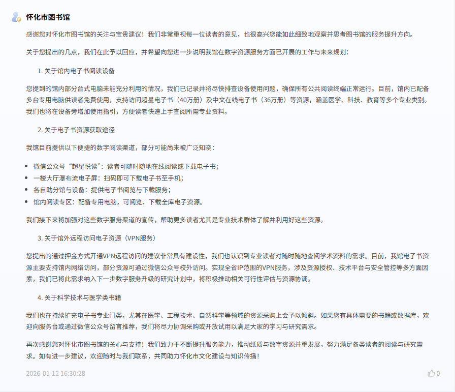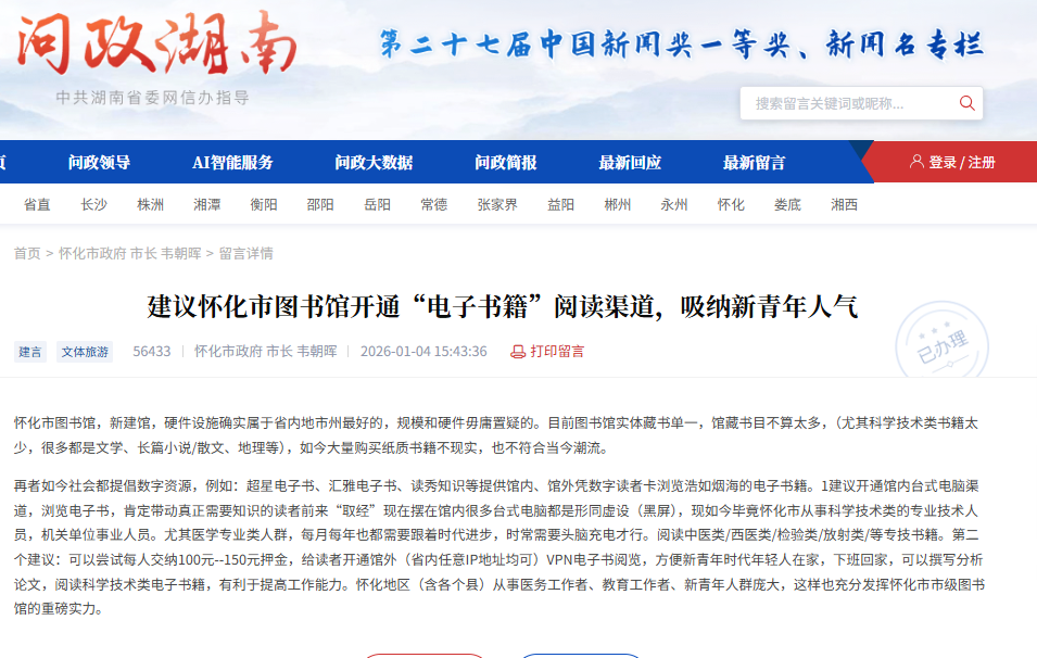 网友在《问政湖南》栏目上的发帖内容与官方回应。 红网时刻新闻1月16日讯(记者 陈星晓)近日,有网友在红网《问政湖南》栏目留言,建议怀化市图书馆开通更便捷的“电子书籍”阅读渠道,以吸纳新青年人气,更好地服务当地专业技术人群。该建议迅速得到了怀化市图书馆的详细回应。 网友建议:盘活设备,开通馆外访问 网友在建议中指出,怀化市图书馆新馆硬件设施一流,但实体藏书,尤其是科学技术类专业书籍相对有限。他认为大量增购纸质书不现实,应顺应数字阅读潮流。 他提出两项具体建议:一是全面激活馆内现有、但时常处于闲置状态的台式电脑,供读者浏览专业电子书数据库;二是探索通过收取适量押金的方式,为读者开通馆外VPN访问权限,使读者在家也能便捷查阅学术资源,便于学习和论文撰写。 图书馆回应:已有基础,正在推进 怀化市图书馆对网友的关注与建议表示感谢,并逐一进行了说明。 关于馆内电子阅读设备,馆方表示已记录电脑设备使用不畅的问题,将尽快排查,确保所有公共阅读终端正常运行。目前,馆内已配备多台专用电脑供读者免费使用,支持访问超星电子书(40万册)及中文在线电子书(36万册)等资源,涵盖医学、科技、教育等多个专业类别。后续,将在设备旁增加使用指引,方便读者快速上手查阅所需专业资料。 关于电子资源获取途径,图书馆列举了现有多个数字阅读渠道: