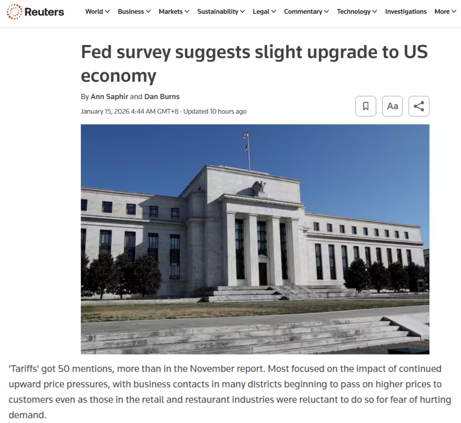 美国联邦储备委员会14日发布的全国经济形势调查报告显示,根据2025年11月中旬至2026年1月初收集的信息,多数联邦储备区经济活动改善,但关税带来的成本压力仍然持续。 根据美国“联邦储备法”,美国全国划分为12个联邦储备区,每区设立一家联邦储备银行。该报告根据12家联邦储备银行的最新调查结果编制而成,也称“褐皮书”。 报告指出,由于库存耗尽或保持利润率的压力加大,一些企业已经开始把关税成本转嫁给消费者。
