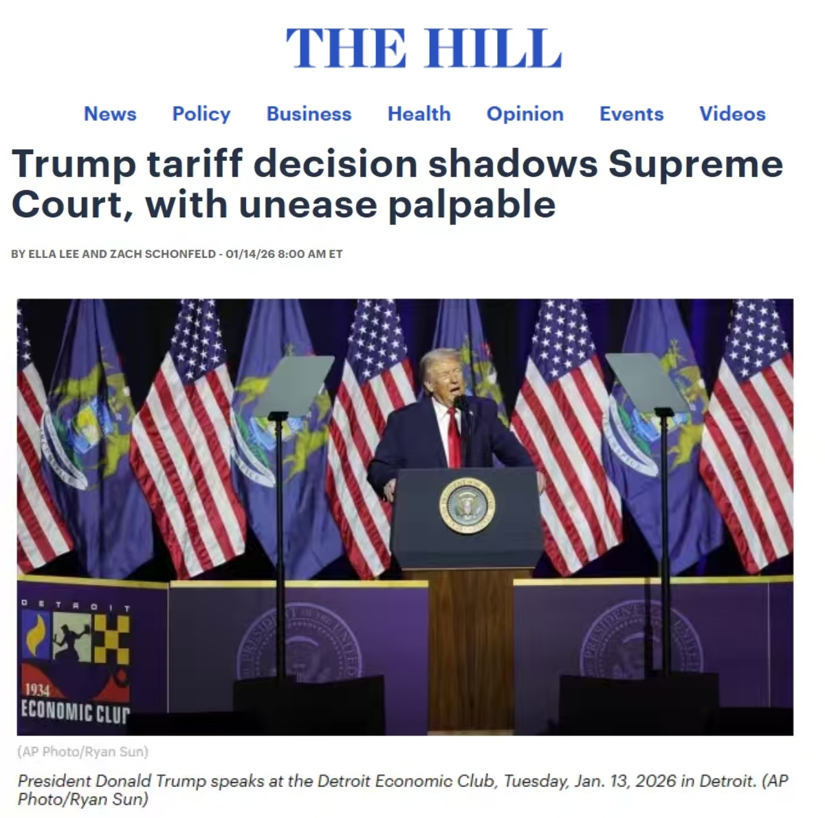 美国《国会山报》报道截图 特朗普政府2025年上台后援引美国《国际紧急经济权力法》,以不经过国会批准、直接颁布行政令的方式出台一系列加征关税措施,在美国国内引发一系列法律诉讼。 在美国联邦巡回上诉法院和美国国际贸易法院分别裁定美国政府一揽子关税政策违法后,美国政府向联邦最高法院提出上诉。联邦最高法院原本宣布将在1月9日就关税政策合法性作出裁决,但当天并未公布裁决结果,而是宣布将裁决日期推至1月14日。 美国联邦最高法院2025年11月曾就美国政府关税政策的合法性举行听证会,听取相关辩论。辩论中,大多数最高法院大法官对政府依靠宣布“国家紧急状态”来征收全面关税政策持怀疑态度。部分大法官质疑《国际紧急经济权力法》是否应该赋予总统加征关税的权限。张茉楠认为,问题之所以这么焦灼,是因为美国内外都面临着关税所带来的巨大不确定性压力。 中国国际经济交流中心美欧研究部副部长张茉楠: