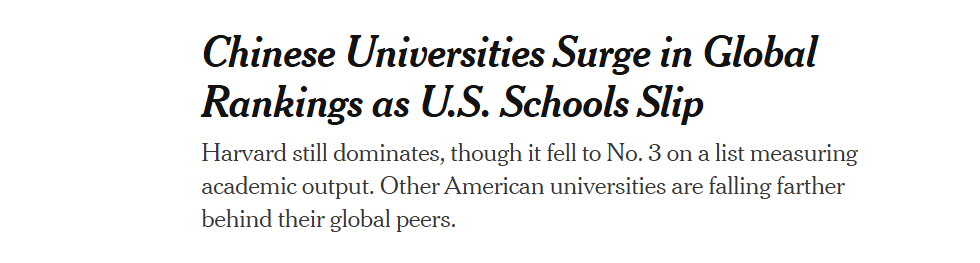 美国《纽约时报》网站报道截图 文章称,这一排名变化正值美国联邦政府大幅削减美国高校科研经费之际,而这些高校严重依赖联邦政府资金来开展科研活动。文章指出,美国高校科研成果排名下降这一趋势早在几年前就出现了,美国政府的政策可能会加速这一趋势。 文章援引英国机构泰晤士高等教育全球事务主管菲尔·巴蒂的话表示,“一场重大变革即将到来,全球高等教育和科研领域的主导地位将出现新的格局。”荷兰莱顿大学科学与技术研究中心服务总监马克·内伊塞尔则在文中表示:“中国确实正在大力提升科研能力。中国研究人员越来越倾向于在那些全球范围内阅读率更高、引用率也更高的英文期刊上发表研究成果。” 文章强调,其他侧重于科研成果的排名体系也反映出类似的趋势,即更加认可中国的科研机构。 在土耳其安卡拉中东技术大学信息学研究所编制的“学术表现大学排名”中,除了哈佛大学位居榜首外,斯坦福大学是进入前十的仅有的美国另一所高校,而前十名中包括四所中国大学。另一项“自然指数”排名中,哈佛大学位列第一,紧随其后的是十所中国高校。
