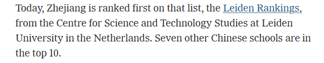 美国《纽约时报》网站报道截图 文章指出,根据荷兰莱顿大学科学与技术研究中心发布的“莱顿大学排名”(一个依照文献计量指标建立的全球大学排名系统),哈佛大学排名降至第三位,同时其他美国大学与全球顶尖学府的差距正在扩大。文章强调,排名正在快速上升的学校是那些强调科研产出数量与质量的中国高校。“莱顿大学排名”显示,中国浙江大学位居榜首,此外还有七所中国高校进入前十名。一些资深学者认为,这些排名反映出中国科研成果的显著增长,并警告称美国正在逐渐落后。