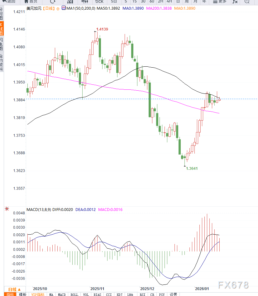 周五亚洲交易时段,美元兑加元小幅回落,交投于1.3890附近,加元因油价反弹获得支撑。加拿大是全球主要能源出口国之一,油价上行对加元形成明显利好。 ![]() 然而,美国经济数据仍为美元提供下行动力的阻力。稳健的劳动力市场及本周发布的零售销售数据进一步强化市场对美联储短期维持利率不变的判断。 摩根士丹利分析师将美联储潜在降息窗口由1月和4月推迟至6月和9月,反映出就业市场稳健和通胀压力仍在。 芝加哥联储主席Austan Goolsbee表示:“在就业市场稳定的充分证据下,央行应集中精力降低通胀。”旧金山联储主席Mary Daly称:“货币政策处于良好位置,可根据经济变化作出适当调整。” 投资者在等待美国12月工业产出及美联储官员讲话,以寻找美元短线方向。 从日线走势来看,美元兑加元近期自1.3980高位回落至1.3890附近,短线多头动能有所减弱。价格已接近10日均线支撑位置,5日均线向下倾斜显示短期修正压力。 MACD快慢线仍在零轴上方,但红柱逐步缩短,表明上行动能减弱;RSI下行至50附近,反映市场处于中性震荡状态。 布林带显示价格从上轨回撤至中轨附近,短期波动率下降。短线关键支撑位在1.3860—1.3880区间,上方阻力位于1.3930与1.3980,如有效突破,则美元可能重拾升势;若跌破支撑,则下行空间可能延伸至1.3820附近。整体结构偏向高位震荡修正。 ![]() : 美元兑加元的短期走势正受到油价与美联储政策预期的双重影响。油价回升为加元提供支撑,而稳健的美国就业与零售数据维持美元基本面优势,使汇价进入震荡博弈格局。 技术面显示短线多头动能减弱,但尚未出现明显趋势逆转信号。预计汇价将在1.3860—1.3930区间震荡,应关注美国工业产出数据及美联储官员讲话对美元的短线冲击。 若油价持续上涨,加元或获得额外支撑;若美经济数据强劲,美元可能短线反弹。