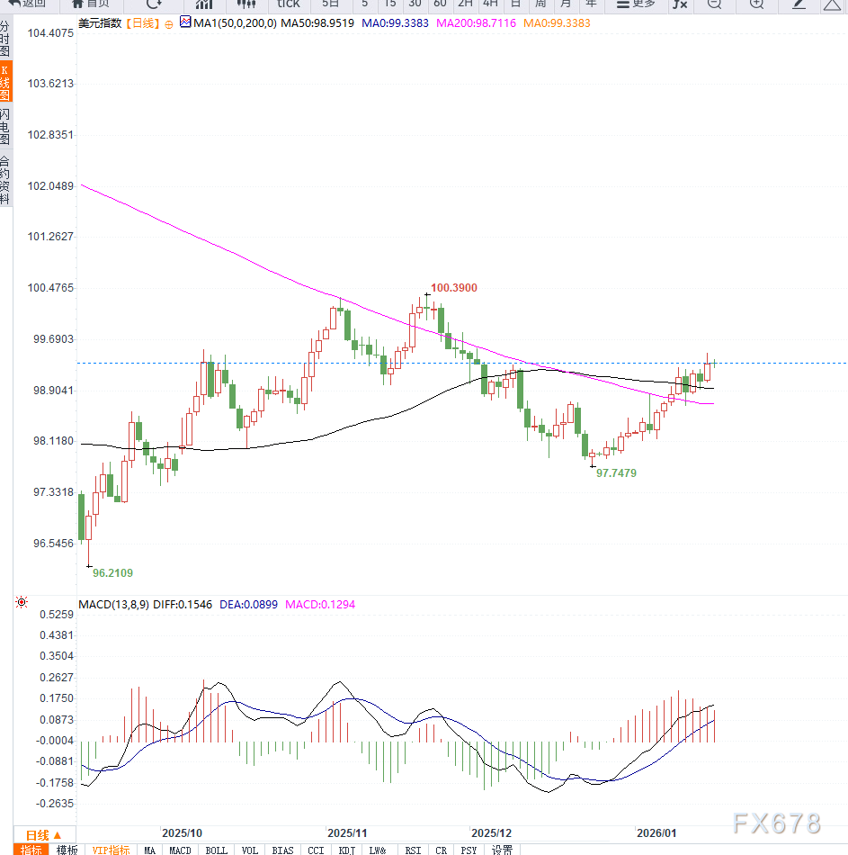 美元指数在前一交易日小幅上涨后于周五亚洲时段温和回落,当前交投于99.30附近。投资者正等待美国12月工业产出数据以及美联储官员讲话,以寻找新的方向指引。 ![]() 数据表明,在长期高利率环境下,美国劳动力市场依然保持韧性,企业裁员压力有限。 利率期货市场的定价进一步印证了这一判断。 根据芝商所FedWatch工具,美联储在1月27日至28日会议上维持利率不变的概率已升至95%左右,投资者对下一次降息的预期时间被推迟至6月。 强劲就业与通胀黏性预期共同推升美元需求。 市场情绪方面,外部不确定性阶段性缓和也对风险偏好形成提振,资本流向更偏向美元资产,使美元指数在高位获得支撑。 从日线结构来看,美元指数在此前连续反弹后稳守98.80上方,并逐步上探至99.30一线,整体仍处于多头占优的运行通道。 价格已连续多日站在5日与10日均线上方,显示短期均线系统维持向上排列,趋势尚未被破坏。技术指标方面,MACD快慢线位于零轴上方并保持温和扩张,红柱动能虽有所放缓,但仍未出现明显转空信号; RSI运行在60附近,表明市场处于偏强但未过热的状态。布林带中轨持续上移,价格贴近上轨运行,反映多头仍掌握节奏。关键位置上,99.50—99.70构成短线重要阻力,若能有效突破,指数有望挑战100整数关口; 下方支撑则位于98.80与98.20,只要不失守该区域,日线级别仍维持震荡偏强格局。整体判断为上升趋势中的整理形态,回调更可能被视为技术性蓄势。 ![]() 美元指数当前的核心驱动已从“降息预期交易”转向“高利率延续交易”。就业数据的意外走强使市场对美联储政策路径重新定价,技术面也显示多头结构保持完好。 但在逼近100关口之际,进一步上行需要更强的数据催化。若工业产出与后续通胀指标继续验证经济韧性,美元有望打开新的上行空间;反之则可能回到98—99区间反复震荡。