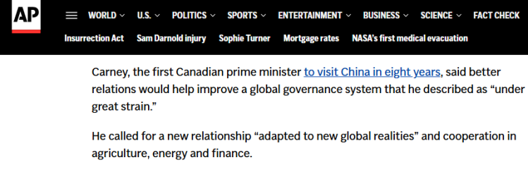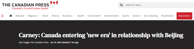 美联社网站报道截图 报道称,卡尼的政府正致力于在“全球贸易动荡时期”构建一个减少对美依赖的经济体系。 加拿大通讯社的报道注意到,卡尼在华期间表示,从能源到农业,从人文交流到多边主义,相关领域的合作将为两国人民带来巨大福祉。渥太华希望这次关系重启能成为“全球分裂与混乱时期合作共赢的典范”。