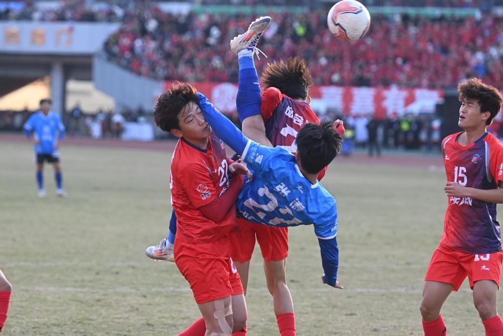 2025年12月14日,永州队球员张涛(右二)在比赛中倒钩射门。郭立亮 摄 更多的情况下,一球成名体现在广义上——通过在赛场的精彩表现成为所在城市家喻户晓的球星,如永州队高响、常德队赵文荻、郴州队蒋政等。 “我以前不知道踢球是为了什么。现在有了‘湘超’这个平台,有那么多球迷关注,我踢球的目标很明确。”屡屡帮助郴州队献上进球、助攻的蒋政在一次直播中说,很羡慕现在的中学生,能在“湘超”这样的平台展现自己。 “湘超”联赛高度重视青少年足球人才培养,禁止中超、中甲等职业联赛现役球员参赛,要求每队同时上场的中学生球员不少于3人。不少中学生抓住机会展现自我,踢出不凡战绩。 数据印证了这一设计的成效:本届赛事618名参赛球员中,中学生245人、大学生98人,占比过半;学生球员共斩获132粒进球,占赛事总进球数的53.4%,实现了“参与度”与“贡献度”的双高契合。 半决赛中,永州队先是由中学生球员彭玢独中两元,将强大的长沙队拖入点球大战。八轮点球后两队战平,永州队又一名中学生站了出来——张家豪推射破门,帮助球队实现绝杀,爆出2025“湘超”最大冷门。 决赛中,永州队凭借谷文杰的头球破门,以1:0战胜常德队,成功捧杯。永州队黄楚儒、高响、唐嘉年分获赛事最佳教练、最佳球员、最佳门将。