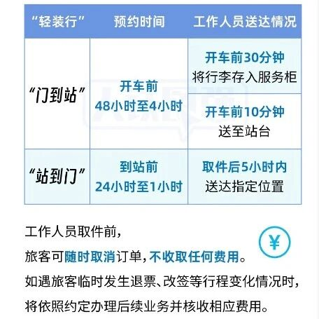 什么是“轻装行”服务? “轻装行”是铁路部门为旅客出行提供的“门到站”“站到门”同城行李搬运服务。在同城距离车站35公里内,旅客根据实际需要可选择以下两种“轻装行”服务: 出发旅客“门到站”行李搬运服务。办理从出发地到车站的业务,可在开车前48小时至4小时预约,由工作人员到旅客指定位置上门收取符合托运规定的行李并搬运至出发车站,通过安检后,按照预约要求,在开车前30分钟将行李存入服务柜或在开车前10分钟送至站台。 到达旅客“站到门”行李搬运服务。办理由车站到目的地的业务,可在列车到站前24小时至1小时进行预约,工作人员在取件后5小时内送达指定位置。