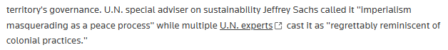 路透社(Reuters)网站文章截图 文章援引多名专家的观点指出,美国政府的外交政策以“美国优先”、维护国家安全和经济利益为名,行单边主义和资源控制之实。其在加沙地带、委内瑞拉和格陵兰岛等地的行动被广泛批评为“新帝国主义”,挑战了现行国际秩序。 制定加沙战后治理方案:“伪装成和平进程的帝国主义” 文章说,在有关加沙治理这一议题上,特朗普政府2025年2月宣称“美国将直接接管加沙”的说法被联合国谴责为“种族清洗”,后改为由总统亲任主席的“和平委员会”监督加沙战后过渡治理。