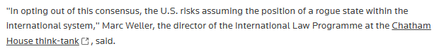 路透社(Reuters)网站文章截图 路透社的文章指出,美国目前在格陵兰岛设有一处军事基地,但仍觊觎同为北约盟友丹麦的这一领土。英国皇家国际事务研究所的国际法专家马克·韦勒(Marc Weller)警告称,此举可能使美国沦为“流氓国家”。文章进一步指出,需要注意的是,特朗普政府此前还多次提及“让加拿大成为美国第51个州”。 |