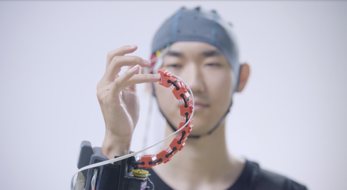 “现在想象,右手腕长出了一根‘第六指’,用它去抓握眼前的小球。”在天津大学脑机交互与人机共融海河实验室(以下称脑机海河实验室)里,科研人员王壮使用“读心术”,操作机械指稳稳抓住桌子上的小球。 这款由脑机海河实验室团队研发的手指穿戴设备,被称为“神工—灵犀指”。据介绍,用意念控制该设备,可以配合人手完成辅助抓握,唤醒患者的功能障碍中枢与外周神经系统,助力手部运动功能康复。脑机接口通过采集脑部神经信号,转换成特定指令。该技术能够在大脑与外部设备之间创建连接,实现“脑”与“机”之间的信息交换。