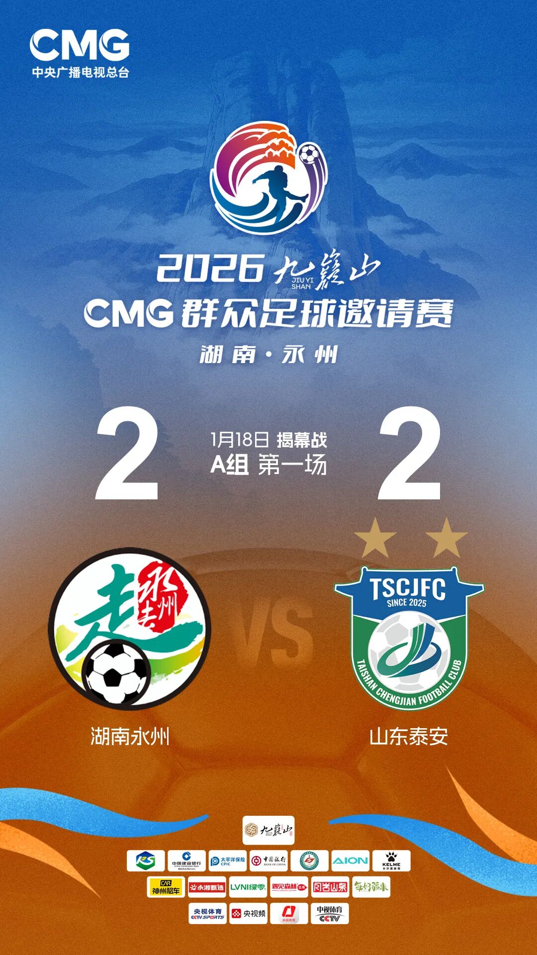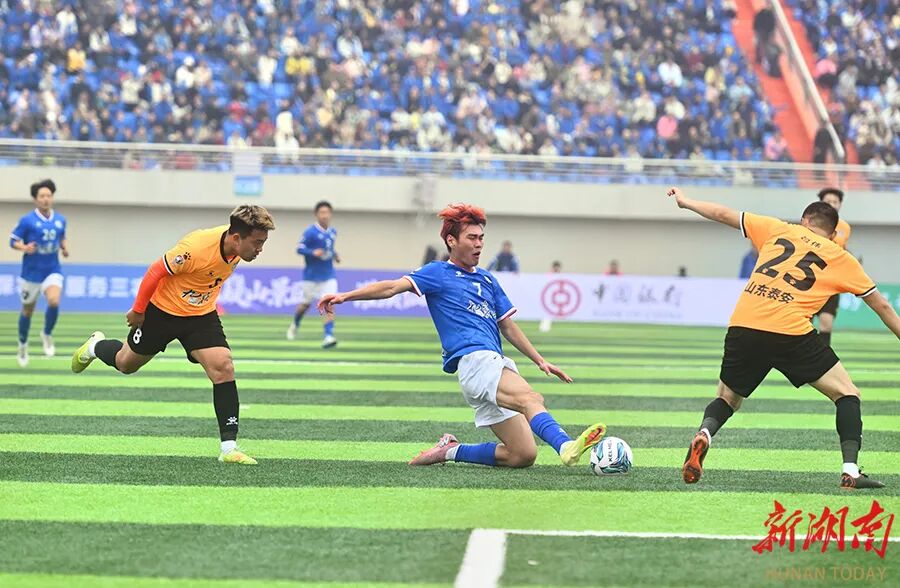 第3分钟,泰安队28号白云飞打进第一粒球;第7分钟,永州队7号林昊用一脚世界波将比分扳平。
