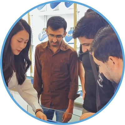 0楼依洋(左一)为外国客商介绍饰品。吴峰宇摄(人民视觉)1月14日,浙江义乌第六代市场全球数贸中心一楼三街“金梦佳人”饰品商铺里,店主楼依洋对着手机反复念出“12345”采集语音;随后打开“世界义乌”商贸大模型 ...
