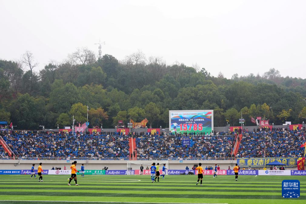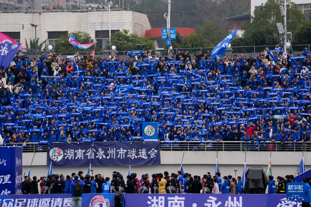 1月18日至24日,2026CMG群众足球邀请赛在湖南省永州市开赛,“湘超”冠军湖南永州队坐镇主场,将与来访的山东泰安队、黑龙江哈尔滨队、青海玉树队、内蒙古呼和浩特队和广东湛江队同场竞技。 自去年年底夺得“湘超”冠军后,千年古城永州的足球热情持续高涨,城区街头巷尾的立柱广告牌、户外电子屏播放着来自各地网友的祝贺。永州市民积极回应,自发设立补给站,用脐橙、柚子等特产迎接八方来客。 永州市体育场成为热门打卡地,人们在体育场外的多幅手绘作品旁驻足合影,体验“挂票”、“砖票”等专属观赛位置。湖南永州队“永冲锋”的文创周边吸引游客驻足……永州以鲜活的方式,将体育荣耀融入城市脉搏,让市民和游客们共庆欢乐,感受永州的体育高光。 1月18日,观众在永州市体育场观看邀请赛揭幕战。在当天进行的揭幕战中,湖南永州队2比2战平山东泰安队。新华社记者 陈振海 摄