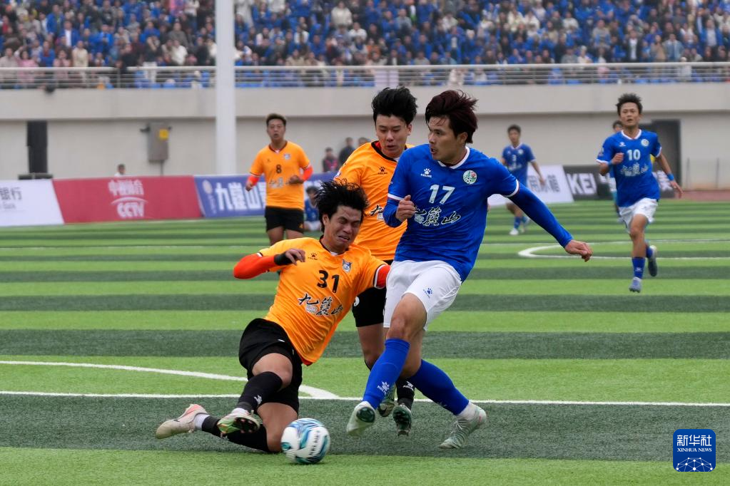 1月18日,山东泰安队球员张翔(前左)和湖南永州队球员梅碧瑞(前右)在揭幕战中拼抢。在当天进行的揭幕战中,湖南永州队2比2战平山东泰安队。新华社记者 陈振海 摄