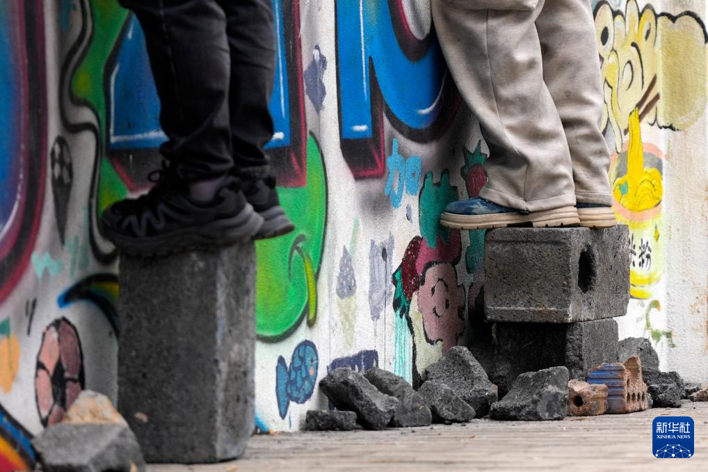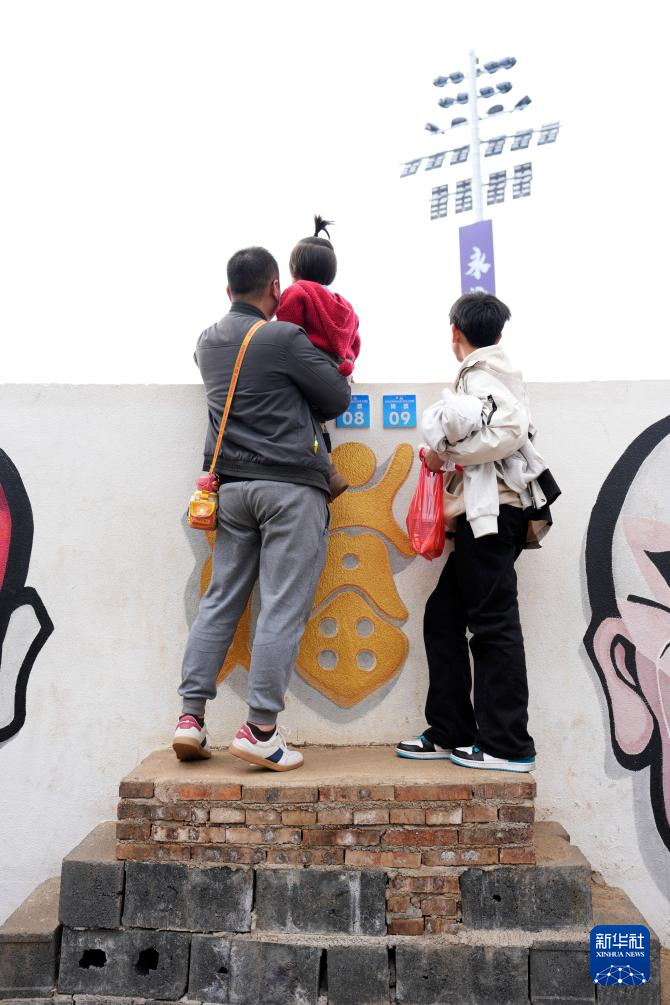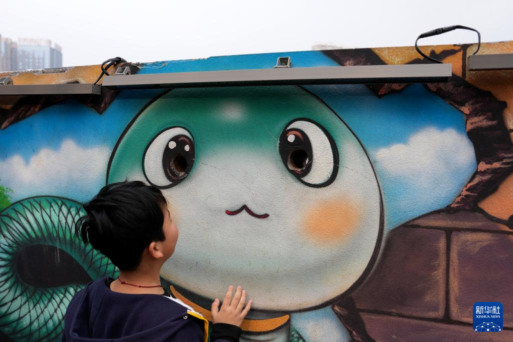 1月18日,观众在永州市体育场外的墙绘前合影留念。新华社记者 陈振海 摄