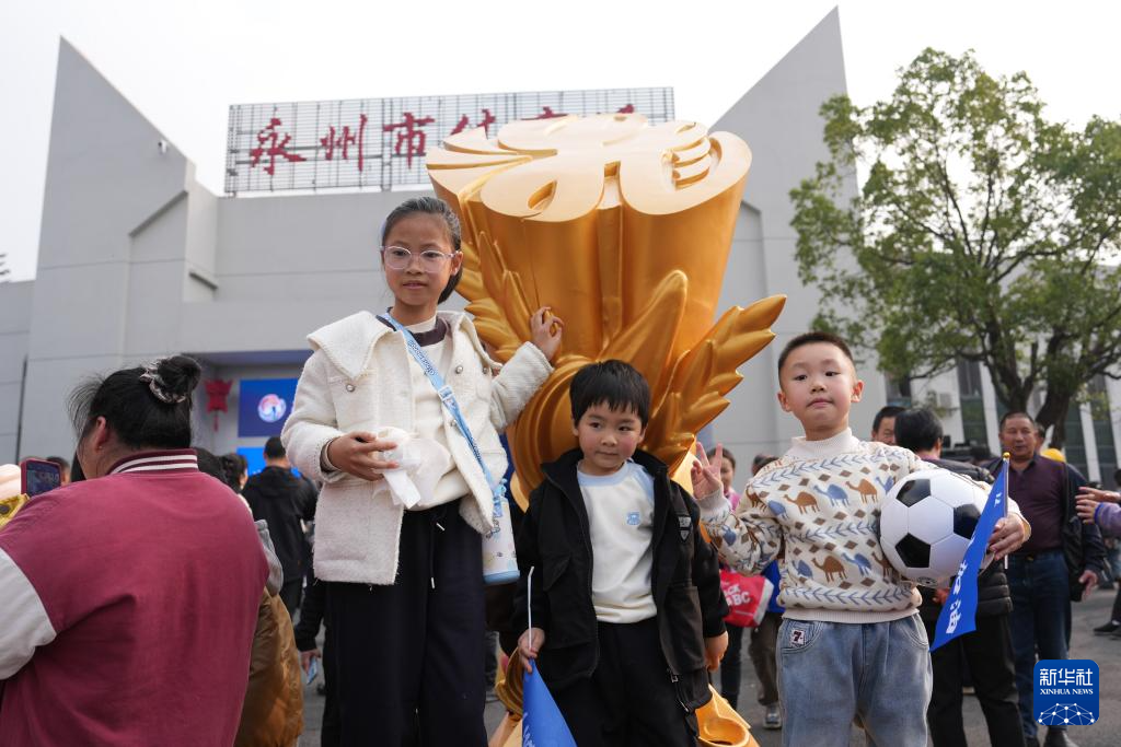 1月17日,小朋友们在永州市体育场外和“湘超”冠军奖杯模型合影。新华社记者 陈振海 摄