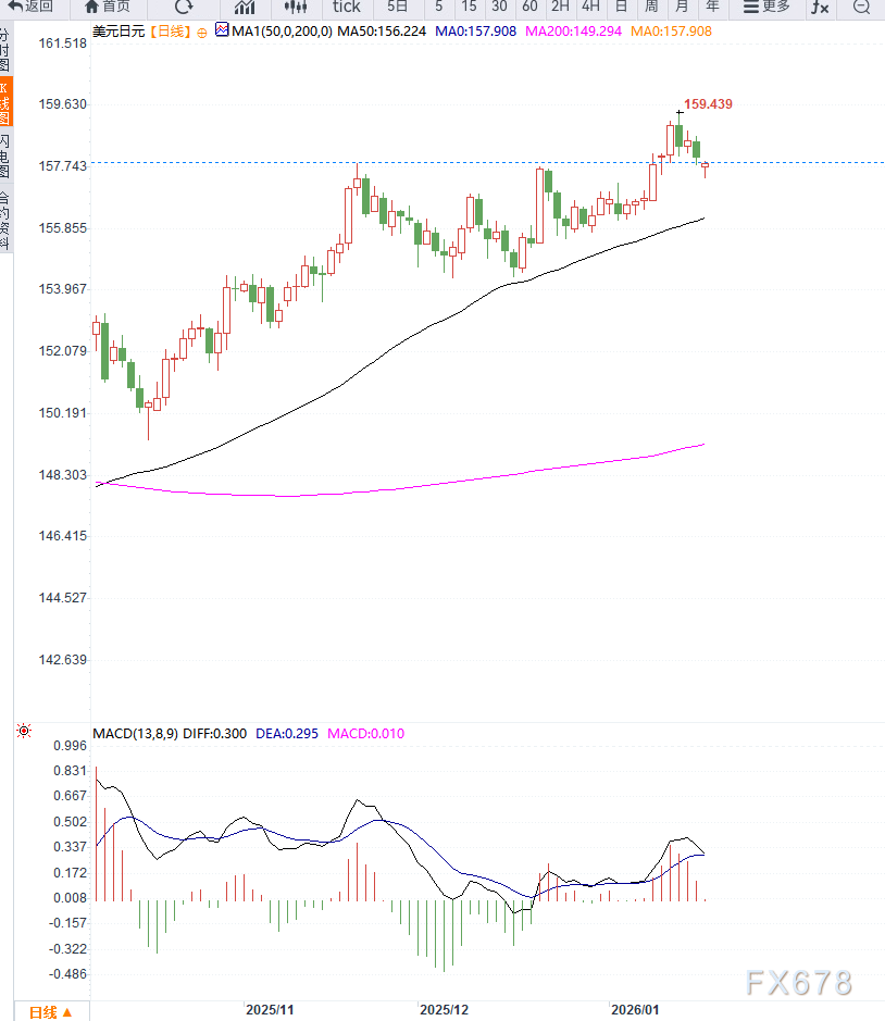 周一亚洲早盘,美元兑日元(USD/JPY)延续调整,下跌至近期一周低位。市场风险偏好减弱、避险资金流入本币,使日元获得阶段性支撑。 ![]() 此外,美国总统特朗普宣布对反对其收购格陵兰计划的八个欧洲国家加征关税,再度加剧贸易紧张局势,提升了包括日元在内的避险货币吸引力。 欧盟主要国家已就劝阻关税措施达成一致,同时准备反制行动,这一政策不确定性进一步刺激避险需求。 另一方面,美国最新公布的劳动力市场数据表现强劲,推迟了市场对美联储近期降息的预期,这一基本面因素为美元提供一定支撑,但整体市场更为关注风险情绪和政策走向的综合作用。 此外,日本首相可能提前解散国会举行大选以巩固财政扩张政策支持,这种政治不确定性可能对日元走势构成双重影响,一方面强化对日元干预的关注,另一方面市场对未来财政与货币政策的不确定性仍存。 综合来看,USD/JPY短期呈现震荡回落格局,受多重因素影响,汇价走势将继续围绕政策信号与全球风险情绪波动。 从日线结构看,USD/JPY在上周触及约158附近高点后出现回落,短期趋势有所放缓。虽然美元在美国强劲经济数据支撑下仍具一定上行动力,但日线技术指标反映日元反弹对价格构成实质压力。 MACD仍略位于零轴附近,显示多头动能尚存但趋弱;RSI回落至中性区域,未再显明显超买状态。短期重要支撑位于157.00及156.50区间,下方若失守可能测试更低支撑; 上方阻力在158.00—158.50区域,需突破该阻力以重新确认涨势。整体日线反映USD/JPY具备震荡偏弱特征,但大级别趋势仍受基本面与政策驱动。 ![]() : 日元近期反弹主要源于官方干预警告与政策预期变化,这在避险情绪推动下快速传导至汇市。美国对外贸易紧张局势叠加全球地缘政治风险,也为日元提供了“避险支撑”。 不过,美国基本面强劲使美元仍具一定支撑力量,这形成多空力量交织的格局。短线来看,关注日本央行利率路径的进一步明朗化、政府干预实际动作的信号,以及美联储政策节奏的变化,将是决定USD/JPY下一阶段走势的关键。