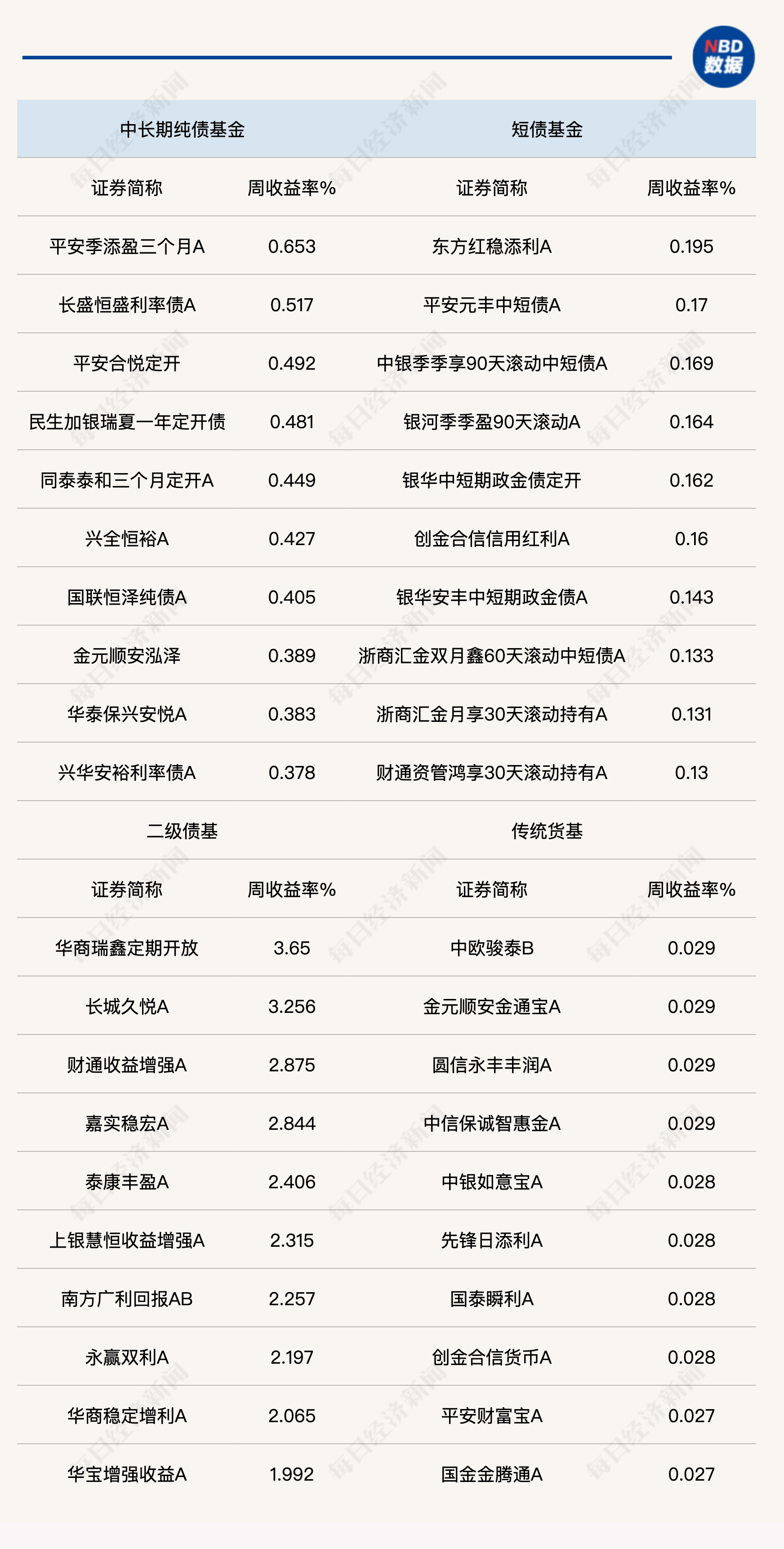 每经记者|任飞 每经编辑|肖芮冬 上周债市震荡偏强,但总体上依然是短债活跃,中长期纯债表现欠佳。 在业内看来,长债资产的供给不足进一步推升了短债的交易性价值,而长债资产的配置性需求仍需释放。不过,就公募基金表现来看,上周中长期纯债基金整体的业绩修复要强于短债基金。 债市修复依然靠短端品种,长期债券供给不足上周(1月12日~1月18日),债市呈现震荡偏强走势,总体呈现修复态势,短端和信用利率下行明显。据国盛证券统计,1年国债利率累计下行4.6bps至1.24%,3年和5年AAA-二永分别下行5.3bps和5.8bps。而长端修复则相对温和,30年国债利率更是持平于2.30%水平,变化有限。 尽管债券的供给在年初暂未大量输出,但记者从部分卖方观察来看,自去年下半年开始,部分政府债券的供给速度开始下降。在业内看来,此类债券的供给下降,推高了机构参与债券配置的意愿,毕竟对于高等级债券来说,短期交易的性价比已非常低。 从目前的期限结构来看,该结构依然偏长。今年前三周4241亿元地方债发行中,10年以上的依然占了大部分,占比58%,与去年基本持平;30年占比高于去年,占比为33.8%,高于去年21.0%的水平。虽然去年下半年以来超长债利差持续攀升,但地方政府目前在发行期限上尚未对此有较为显著的反应。 国盛证券指出,由于此前高息定期存款的到期,以及近期股市的强劲表现,市场担忧存款外流到非银,或者定期存款活期化以及非银化,这一方面可能导致银行负债产生缺口;另一方面,存款活期化或者非银化也会导致存款久期下降,使得银行被迫减少长久期资产或者低流动性资产配置。 对银行来说,如果缺少存款或者部分流动性指标面临压力,短期能够补充稳定负债的有效方式就是发行存单,这在过去几次负债面临压力时期都有发生。过去四周,银行存单净偿还8855亿元,今年以来依然是净偿还。而从资产配置角度来看,银行年初以来也是持续增配存单。从存单角度来看,银行尚未出现明显缺负债或者缺流动性指标的情况。 当前,交易结构上继续呈现出非银减配,银行保险等配置性机构增配的情况,而非银将仓位从长债转向信用债,推动了二永和信用债走强。而短期债市震荡,继续调整空间有限,等待增配机会,或在1月下旬或之后。 纯债基金业绩有所修复,短债基金却不及中长债基金上周,纯债基金的业绩修复明显。从Wind统计的数据来看,业绩均值普遍较此前一周明显提升。其中,中长债基金业绩均值达到0.10%,短债基金达到0.05%。 虽然前述分析到有关短债资产的性价比较低,但从公募基金的表现来看,此类品种的交易活跃度依然比长债要高。事实上,作为一种交易性大于配置性的资产,短债的交易活跃也在促使此类资产价格上升,进而加快了短债基金的业绩修复速度。 头部业绩产品当中,平安季添盈三个月A上周业绩达到0.65%,是所有纯债基金当中业绩最好的一只;紧随其后的是长盛恒盛利率债A,上周业绩达到0.52%;此外,平安合悦定开、民生加银瑞夏一年定开等多只基金单周业绩在0.4%以上。 反观短债基金,上周业绩最好的是东方红稳添利A,达到0.19%。而从中长期纯债基金的业绩来看,在0.2%以上的产品数量有118只(统计初始基金),所以两类产品的业绩表现差异明显。