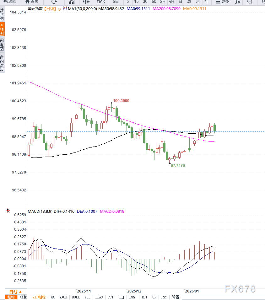 本周初美元整体表现疲软,美元指数下跌至99.15附近,在主要货币中处于弱势地位。市场情绪受到美国与欧洲在格陵兰问题上的外交摩擦影响,投资者对美元资产的信心有所降温。 ![]() 分析人士认为,这一事件可能对美欧关系带来长期不利影响,欧洲在贸易结算与金融合作上或将寻求更多替代方案,从而削弱美元在国际支付体系中的主导地位。 资金流向显示,美元兑瑞郎等避险货币明显走弱,市场风险偏好正在重新定价。 与此同时,美联储内部的政策信号也拖累美元表现。 美联储负责监管事务的副主席鲍曼表示,在劳动力市场仍显脆弱的背景下,美联储应做好将利率逐步降至中性水平的准备。该表态被市场解读为偏鸽派立场,与此前因经济数据强劲而推迟降息的预期形成对比。 从汇市结构看,周一美元对多数主要货币普遍下跌,其中兑瑞郎跌幅最大,兑欧元、英镑和日元也出现不同程度走软。资金重新流向非美资产,显示市场对美元的短期信心正在减弱。 日线结构显示,美元指数在触及99.60附近后承压回落,目前交投于99.15一线,短期多头动能明显放缓。5日均线开始拐头向下并接近99.20,对价格形成短线压制,10日均线位于99.05附近构成初步支撑,20日均线仍位于98.80一带,维持中期支撑结构。 MACD红柱持续收窄,快慢线逐步向零轴靠拢,显示上行动能减弱;RSI回落至52左右,脱离前期偏强区间,表明市场情绪由偏多转为震荡。 若后市跌破99.00—98.90支撑带,指数可能进一步回测98.50;上方关键阻力位于99.40及99.60,只有重新站稳99.60上方,才能恢复偏强格局。整体来看,美元指数短期转为震荡偏弱,技术面存在进一步回调风险。 ![]() : 美元本轮回落并非单一经济因素所致,而是地缘政治与货币政策预期共振的结果。格陵兰争端加剧了跨大西洋不确定性;同时,美联储官员的鸽派表态又削弱了利差支撑。 短期内,若关税威胁继续发酵,美元或延续承压;反之若局势缓和,美元仍可能在支撑位附近企稳反弹。需重点关注美欧政策博弈与美联储表态对市场预期的再塑造。