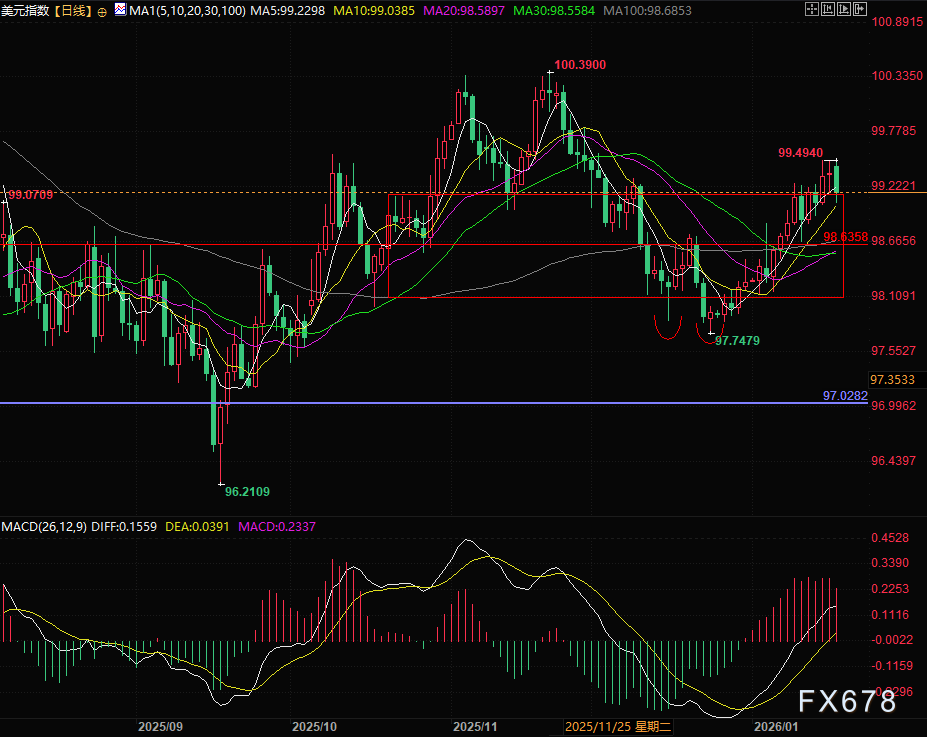 0周一(1月19日)亚欧时段,美元指数走出探底回升走势,目前守在99.24的5日线附近,交投于99.23。 近期美元指数走势呈现明显震荡格局,早盘受美欧格陵兰岛主权博弈升温影响,汇价一度大幅回落,下探99.00附近 ...