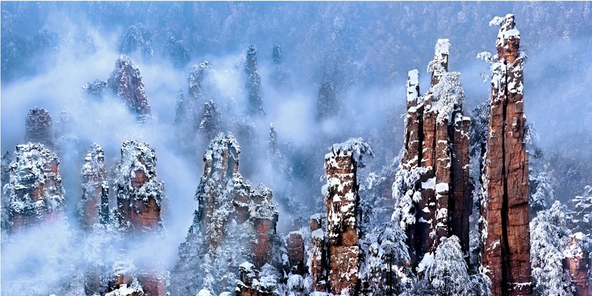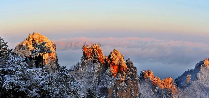 受高海拔与低温气候共同作用,天子山、黄石寨等核心游览区的石英砂岩峰林被冰雪全面覆盖,呈现出“千峰披银、万壑凝霜”的壮丽奇观。每日破晓时分,山间充沛的水汽遇冷凝结,形成浩瀚云海,沿山谷缓缓漫卷、铺展,与洁白无瑕的雾凇景观相互映衬,共同勾勒出一幅动人心魄的自然画卷。