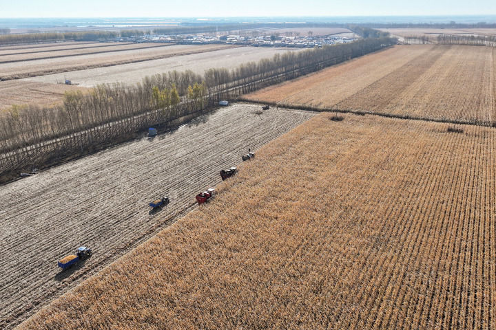 2024年10月16日,在黑龙江省肇东市五里明镇东升村,农民驾驶农机进行收割作业(无人机照片)。新华社记者 谢剑飞 摄 产业链供应链韧性提升——制造业增加值连续16年稳居世界首位,装备制造国产化率不断提高,电气机械、交通运输设备总供给中的国内制造占比均超过95%。 “一系列成就既印证了我国高质量发展的路径正确、成效显著,更积蓄了未来发展的强大动能。”康义说。