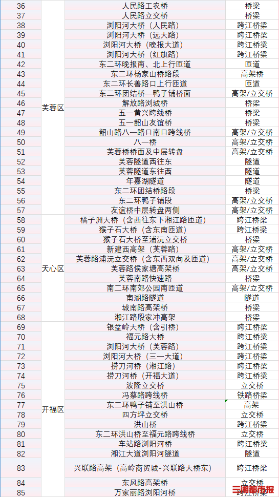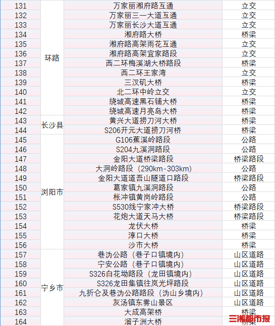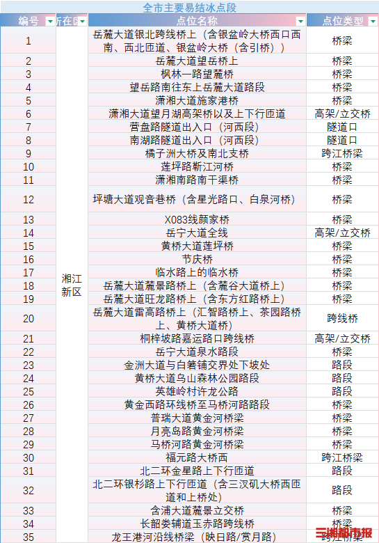 164处易结冰点段有警力全天候巡逻,一旦道路出现积雪、结冰,交管部门将视情况联动其他部门扫雪、融冰,并采取临时交通管制措施。长沙正迎来低温雨雪冰冻天气,1月19日,长沙市公安局交管支队发布全市164处易结冰点段。提醒市民,冰冻雨雪天气行车请注意“降速、控距、亮尾”,减少并线与超车,避免急刹和猛打方向。 路面交警已配备拖车绳、防滑链 1月19日上午,长沙湘府路大桥附近,长沙市公安局交管支队天心大队黑石铺中队民警缪涛在执勤时,提醒过往行人和驾驶员注意安全。中队辖区内的湘府路高架天心大道南北匝道、湘府路至湘府路大桥上下行匝道,均为易结冰点段。 “雨雪天气易导致路面湿滑、视线不清,追尾、剐蹭及车辆侧滑等事故较为多发。”缪涛介绍,“此类事故多因车速过快、跟车过近或操作不当引发。我们已在重点路段加强执勤,并配备了拖车绳、防滑链等救援工具,随时为遇困群众提供帮助。”缪涛特别提醒接送孩子放学的家长,尤其是骑行电动车的家长,一定要降低车速、注意安全。 长沙公布164处主要易结冰点段 长沙已迎来雨雪降温天气,为保障道路交通安全畅通,长沙公安交管支队已提前部署,启动应急预案,全面做好各项应对准备工作,并发布了长沙全市主要易结冰点段共164处。 “今日开始,我们已经采取全天候守望的模式,每个易结冰点段都有警力24小时值守,结冰情况一小时一报。一旦道路出现积雪、结冰,根据情况及时联动其他部门开展扫雪、融冰作业,并采取临时管制、分流等管控措施,预防多车相撞连环事故发生。”长沙市公安局交管支队指挥调度大队民警刘俊介绍,地理位置特殊的路段更易结冰,主要包括临近跨江桥梁、风口区域及横跨湘江、浏阳河、靳江河、捞刀河的路段,如三汊矶大桥、湘府路高架、西二环梅溪湖桥路段等,这些路段在低温天气下结冰风险高于其他区域,开车经过时需特别注意。 长沙交警提醒广大市民,恶劣天气非必要不驾车出行,如有出行需求请尽量选择公共交通。如需驾车出行,上车前请仔细检查车辆状况,确保车辆性能正常;行车途中保持前挡风玻璃及后视镜视野清晰,避免随意变道、穿插,切勿采取紧急制动措施,主动降低车速。驾车行经高速公路、桥梁、隧道、山区临水临崖及风口等易结冰路段时,务必提前规划路线,谨慎驾驶。如果发生轻微交通事故,需在确保自身安全的前提下,拍摄2至3张事故现场照片,随后将车辆撤离至路边安全区域,等待民警处置。此外,低温天气易诱发心脑血管和呼吸道疾病,请有基础疾病的驾驶人尽量避免单独出行。