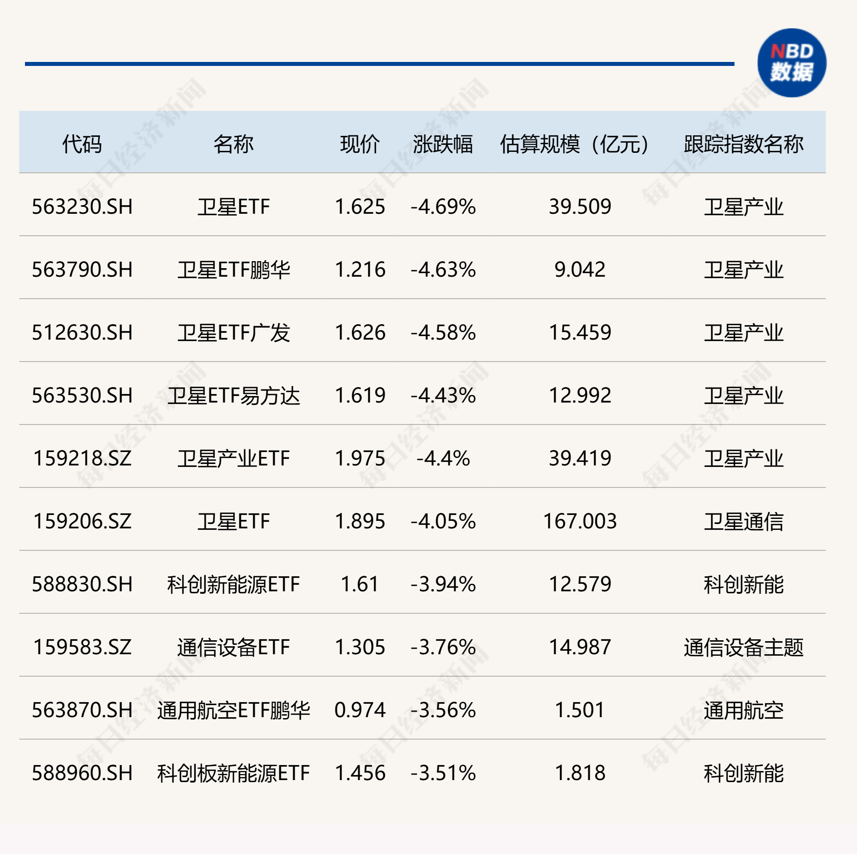 有券商表示,行业目前盈利已触底,价格经历多年竞争目前已无向下空间,此次借助反内卷政策行业对提价及盈利改善诉求强烈,2025年防水、涂料、石膏板等多品类持续发布提价函,行业盈利有望触底,2026年可期待龙头企业的盈利改善。 下跌方面,卫星相关ETF跌超4%。