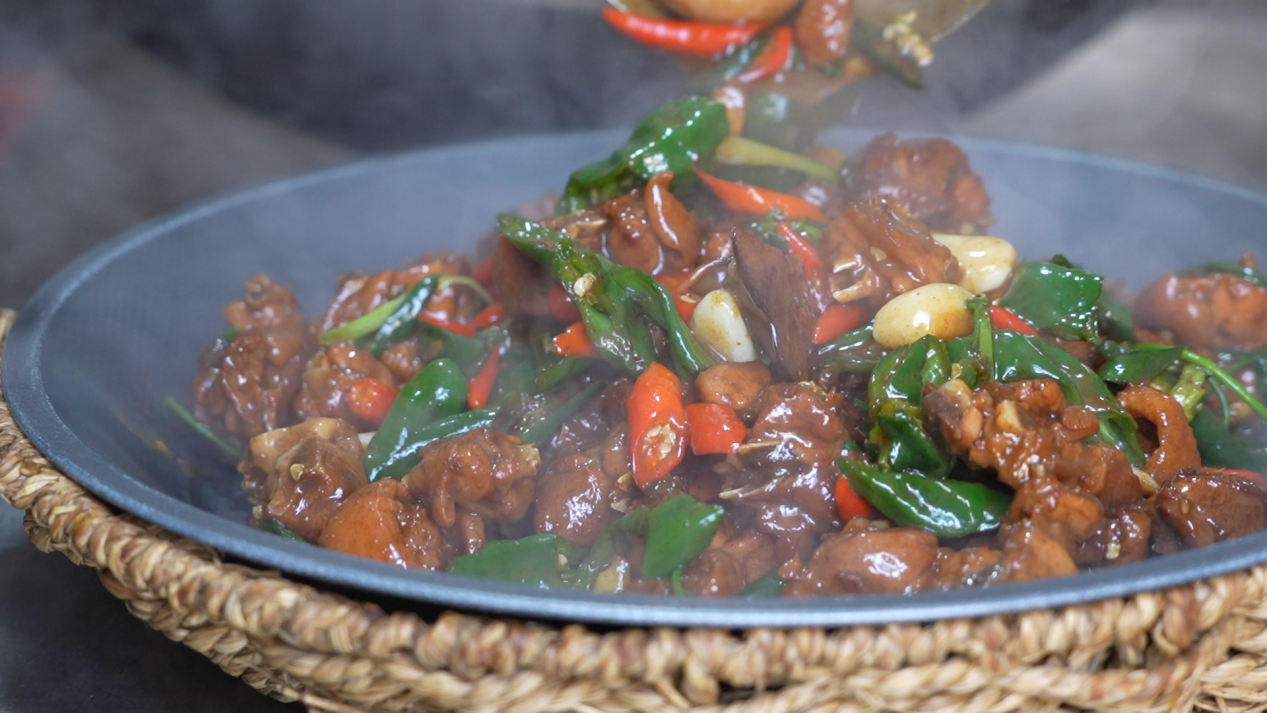 一条街飘起“炒鸡香” 冰雪点燃的,不只有运动的激情,还有随之升腾的烟火气。晌午时分,距雪场不远的磨石塘村“炒鸡一条街”已是香气缭绕、人声鼎沸。“炒鸡王”店里座无虚席,店主王悦璇端着大盘,利落地穿梭在各桌之间。 令人意想不到的是,这位手脚麻利的老板娘,平日里还是一位教授古筝的清雅老师。“用的都是本地散养的‘茱萸跑山鸡’,肉质紧实有嚼头。很多客人滑完雪就寻着味儿来了,节假日一天翻两次台是常事。”她笑着指向墙上的旅游地图,向客人热情介绍周边玩法。从抚弄琴弦到掌勺炒鸡,王悦璇的生活,因冰雪而多了一份热腾腾的滋味。