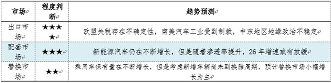 出口市场方面,2026年中国半钢轮胎出口面临较大的挑战,2025年其主要出口地区均出现不同幅度的下滑。首先出口最大欧盟,欧盟对中国反倾销调查初裁虽然取消,但是2026年6月份仍旧执行终裁。若欧盟真的对从中国进口的半钢轮胎征收高昂的双反税,那么中国半钢轮胎出口欧盟或将出现断崖式下滑,对整体出口将形成较大冲击。其次南美汽车工业受到制裁、中东地缘政治不稳定等因素,均制约着2026年中国半钢轮胎出口,预计2026年中国半钢轮胎出口存在较大不稳定性,同比呈现增长的可能性不高,整体表现或不及2025年。 配套市场方面,2026年中国核心驱动力来自汽车保有量扩容、新能源车换胎周期启动以及终端消费能力提升的共同作用。首先,中国宏观经济预期保持稳定增长,为汽车市场提供坚定支撑;其次,截至2025年9月年中国汽车保有量达到3.63亿辆,国内千人汽车保有量约为250辆,较发达国家仍有较大增长空间。 替换市场方面,2026年国内半钢轮胎配套消费量整体将呈现增长趋势,主要得益于一方面是中国宏观经济的温和增长,为乘用车市场奠定坚实的支撑;另一方面是乘用车市场的稳健增长,新能源汽车将持续提升,成为市场增量的主导力量。 2.2 供应维持增长趋势 供应方面,2026年中国半钢轮胎行业或仍难改变,行业仍旧按需生产。2026年中国半钢轮胎内外市场需求表现存在一定的差异性,国内需求呈增长趋势可能性较大,但是出口市场存在较大不确定性,并且中国半钢轮胎出口依存度高,出口对整体市场需求有较大影响。但是国内市场需求呈增长趋势,将和出口下滑呈现对抗趋势,所以预计全年整体需求量变化量有限,更多或维持小幅变化为主。同时整体供应量也随之小幅调整。 3 2026年行业竞争激烈 2026年中国半钢轮胎产销变化幅度有限,甚至可能出现下滑趋势,但是国内半钢轮胎产能仍在不断增长。卓创资讯通过对2026年半钢轮胎企业规划调研,2026年中国半钢轮胎产能仍将维持稳步上升态势,年内半钢轮胎新增产能预计在1900万条左右,同时在部分厂家产能调控后国内转移产能预计在1000万条,最终2026年产能预计增长900万条左右。随着产能不断增长,国内市场产能过剩的现状将进一步加剧,行业竞争激烈,市场不乏出现以价换量的可能。 (责任编辑:董萍萍 )