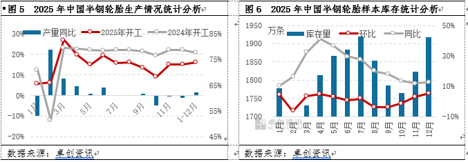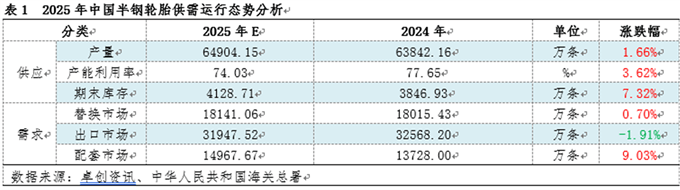 1.2 供应分析 2025年虽然出口销量在出口主要市场拖累下呈现小幅走弱趋势,但是内下表现强劲,特别是在新能源汽车带动下,配套市场达到乐观增幅,带动全年需求量呈增长趋势。在需求带动下,2025年半钢轮胎整体产量实现同步增长。但是由于2025年半钢轮胎产能迎来集中释放期,全年产能约增长5450万条,但是需求增幅不及产能增幅,导致2025年半钢轮胎产能利用率不足,年度产能利用率为74%,较去年同期走低3.3个百分点。 一季度半钢轮胎企业库存仍有一定空间,再加上市场积极进货备库,轮胎企业出货较好,积极生产,整体保持较高产力。再加上新增产能尚未释放,整体产能利用率水平较高,高于去年同期水平。但是随着新增产能逐渐释放,轮胎市场需求有限,轮胎企业库存不断增长,整体远远高于去年同期水平,轮胎企业有意控制开工,整体表现不及去年同期。但是在产能增长情况下,全年产能仍呈小幅增长趋势。