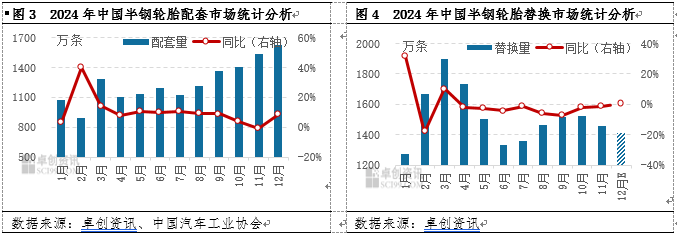 2025年中国半钢轮胎主要出口地区中,仅有向非洲以及亚洲地区出口量呈现增长趋势,主要出口地区欧洲、南美以及中东非地区出口量均呈走低趋势。向欧洲地区出口走低主要是欧盟反倾销调查影响,四季度向欧盟出口放缓,拖累年度出口量呈走低趋势。另外,南美由于快速发展的汽车工业对轮胎有一定的需求。但是2025年美国对南美汽车征收一定的关税,南美汽车工业受到一定拖累,进而拖累中国向南美出口。中东地区由于地缘政治原因,中国半钢轮胎向其出口呈现走低趋势。由于主要出口国出口需求出现下滑,中国半钢轮胎企业积极开发非洲以及亚洲地区市场,向其出口量呈增长趋势。 国内需求同比增长 2025年虽然出口市场呈现下滑趋势,但是国内市场表现较好,需求有所增长。首先配套市场方面,近几年来中国乘用车处于传统燃油车向新能源汽车过度阶段,在新能源汽车快速增长情况下,中国乘用车产销实现乐观增长,带动半钢轮胎配套量增幅可观,年度累计增幅达到9%以上。其次是替换市场,虽然2025年消费者换胎意向相对薄弱,但是在乘用车保有量不断增长情况下,2025年替换市场需求量仍实现了小幅增长。