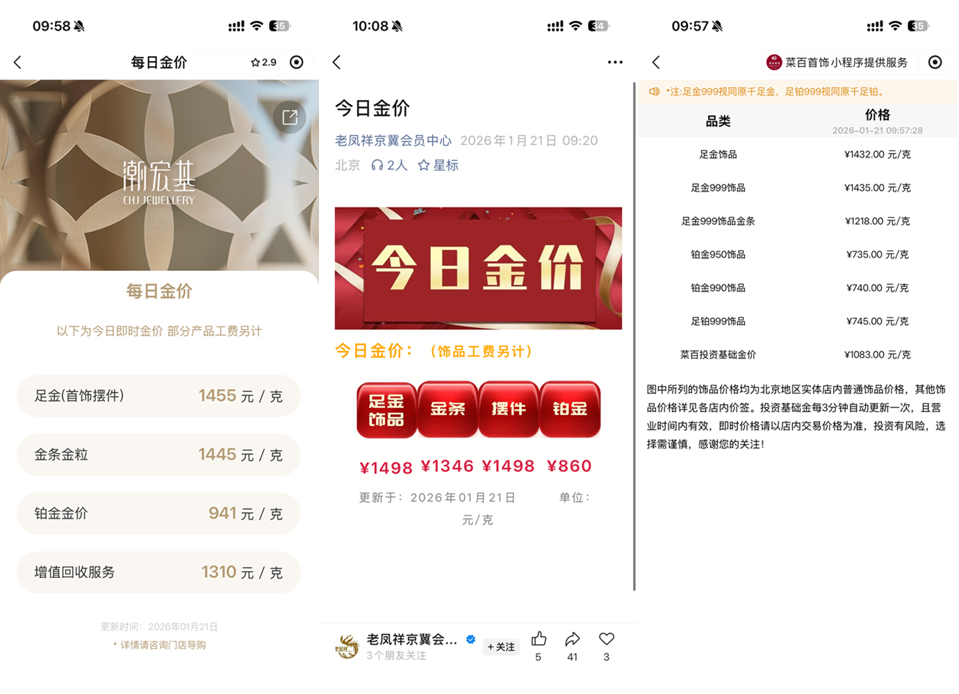Wind截图 国内各品牌金饰克价水涨船高。21日上午,老庙足金饰品价格为1493元/克;周大福饰品、工艺品类足金价格为1455元/克;周生生足金饰品价格为1495元/克;潮宏基足金(首饰摆件)价格为1455元/克;老凤祥足金饰品价格为1498元/克,菜百足金999饰品价格为1435元/克。