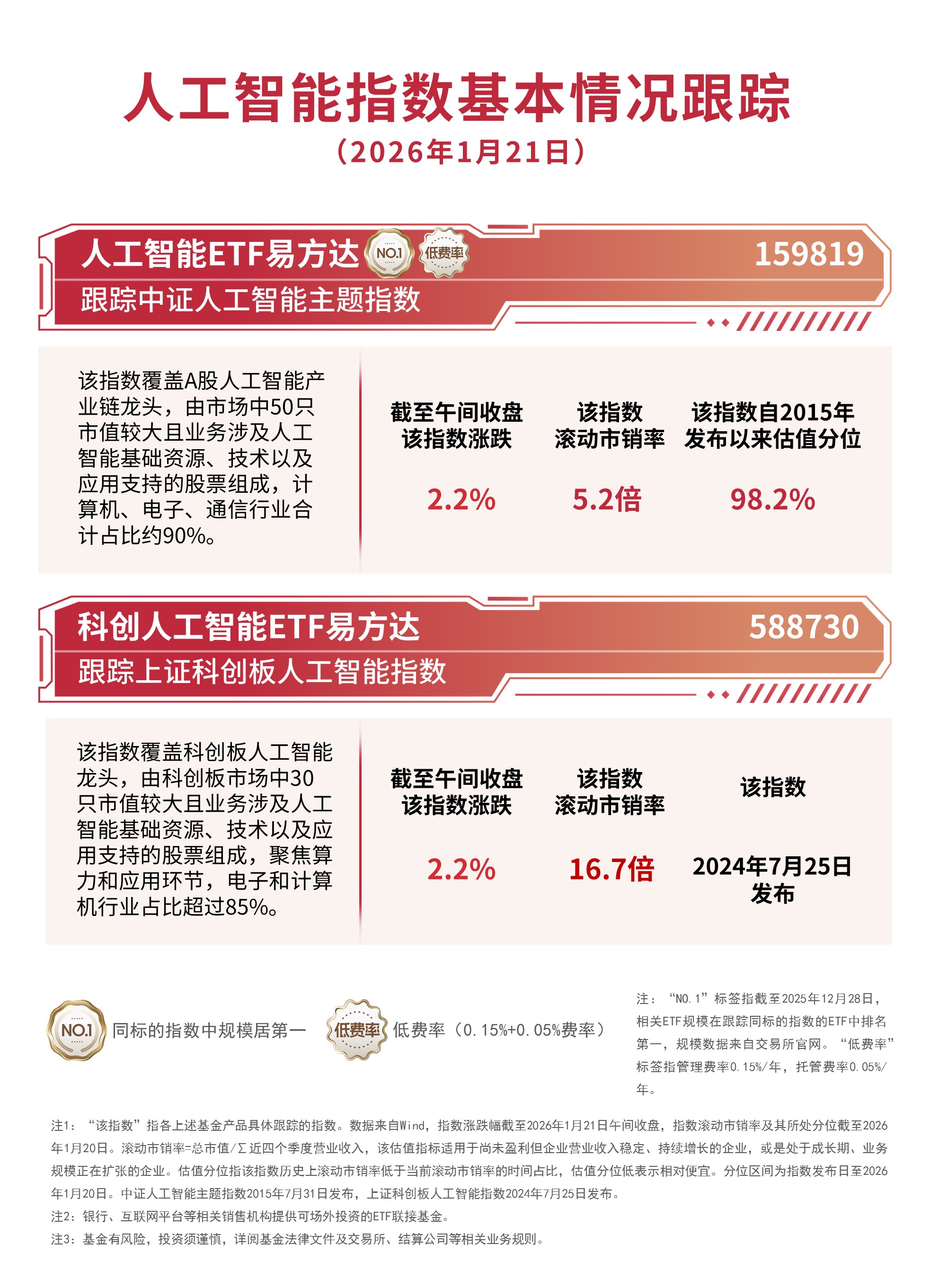 0今日早盘,科技方向集体反弹,芯片概念股涨幅居前。截至午间收盘,中证人工智能主题指数、上证科创板人工智能指数均上涨2.2%。相关ETF受关注,人工智能ETF易方达(159819)此前连续7个交易日获资金净流入,合计超25 ...