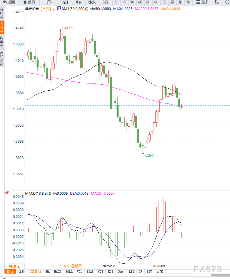周二亚洲早盘,美元兑加元小幅走高,交投于1.3835附近,但反弹力度有限。市场情绪整体偏谨慎,主要原因在于美欧之间围绕格陵兰问题的摩擦持续发酵,贸易担忧情绪再度成为影响美元走势的重要变量。 ![]() 从基本面来看,加拿大最新公布的通胀数据整体符合“温和回落”的特征。 尽管年率小幅回升,但月度数据走弱,且核心通胀继续放缓,使加拿大央行在政策上具备更大的观望空间。市场普遍预期,加拿大央行在即将到来的利率决议中大概率维持利率不变,并可能在较长时间内保持政策稳定。 这种相对明确的政策预期,与美国面临的政治与外部不确定性形成对比,使加元在情绪层面获得一定支撑。 从技术面观察,美元兑加元日线走势仍处于高位震荡格局。价格在前期高点附近反复受阻,显示上方抛压依然存在。短期均线走平并开始向下拐头,暗示上涨动能有所减弱。 动能指标方面,日线RSI徘徊在中性区域,未能形成新的强势信号,表明汇价更多处于方向选择阶段。若后续跌破关键支撑区间,技术形态或转向震荡偏弱;反之,只有在明确利多驱动下,汇价才可能重新挑战前高。 “美元近期明显承压,而加元正从这种波动中受益,市场显然被美国方面的政策动作所扰动。”——Rahim Madhavj ![]() 整体来看,美元兑加元正处于基本面与情绪面博弈阶段。贸易担忧情绪和政治不确定性对美元构成持续压制,而加拿大央行相对稳定的政策预期为加元提供支撑。 在缺乏明确方向性催化之前,汇价更可能维持高位震荡、重心略偏下行的运行格局,需重点关注外部风险事件对美元信心的进一步影响。