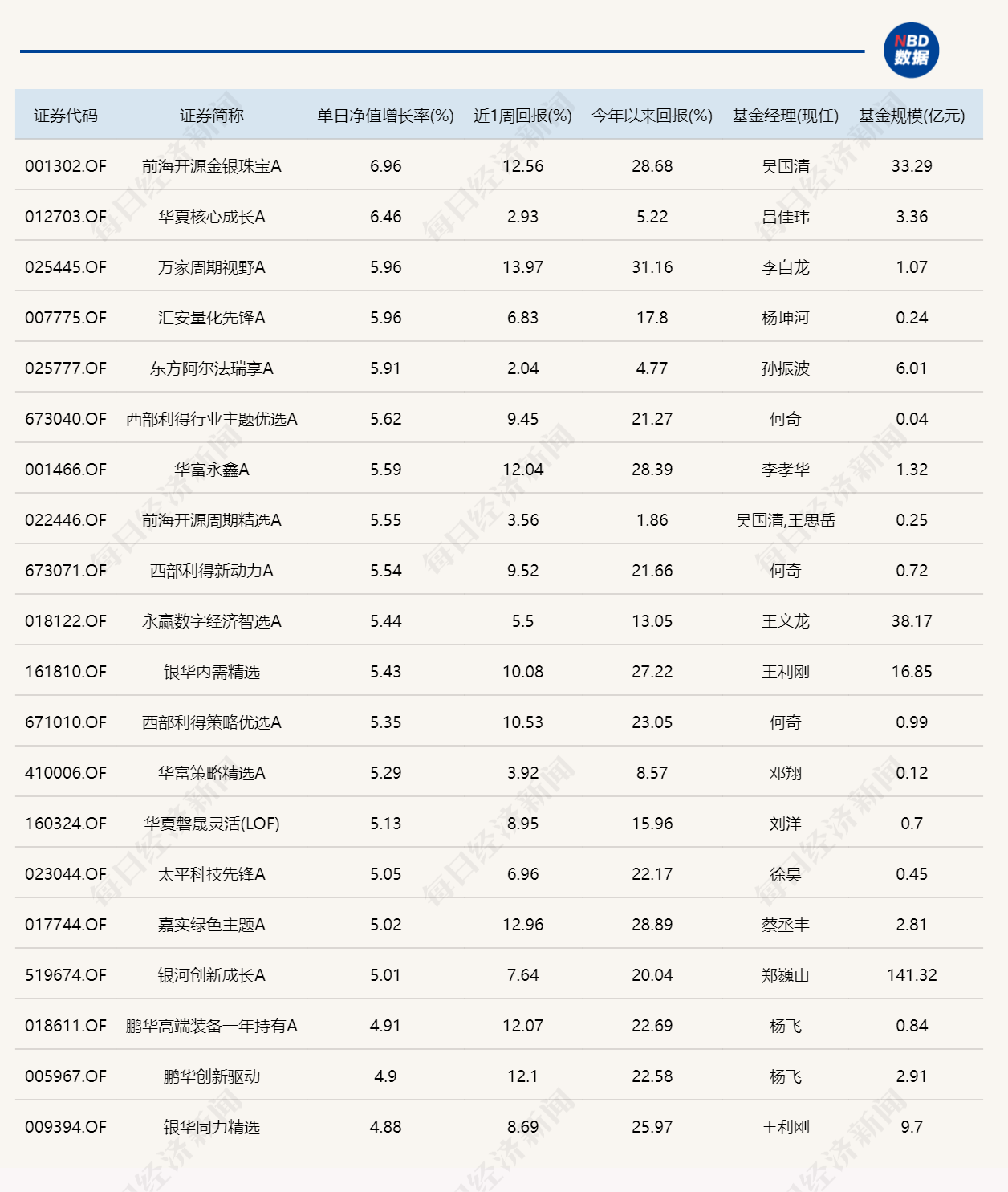 每经记者|肖芮冬 每经编辑|赵云 1月21日,市场冲高回落,沪指午后一度翻绿。板块来看,贵金属、芯片产业链、锂矿、油气等概念表现活跃。下跌方面,大消费板块集体走弱,白酒方向领跌。银行板块震荡下跌。全市场超3000只个股上涨。沪深两市成交额2.6万亿元,较上一个交易日缩量1771亿。 下面一起来看今天公募基金的表现。 (注:榜单1、榜单2仅选取灵活配置型、偏股混合型和普通股票型三类产品作为主动基金的代表,纳入统计;债基相关榜单包括各类主、被动债券型基金) 1.单日涨幅榜